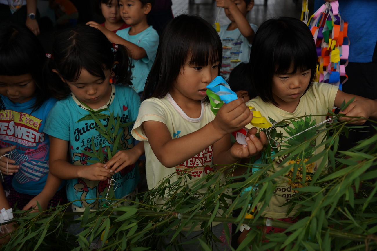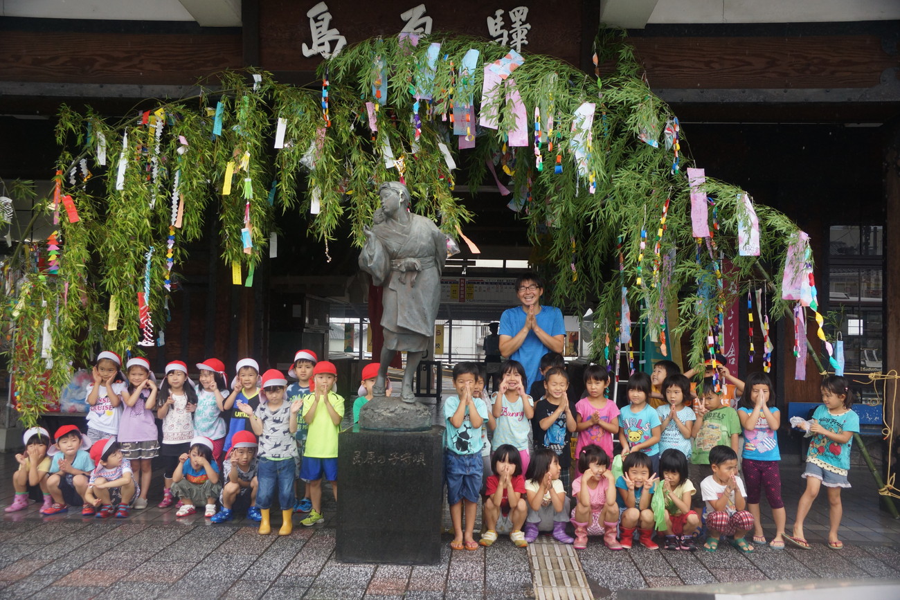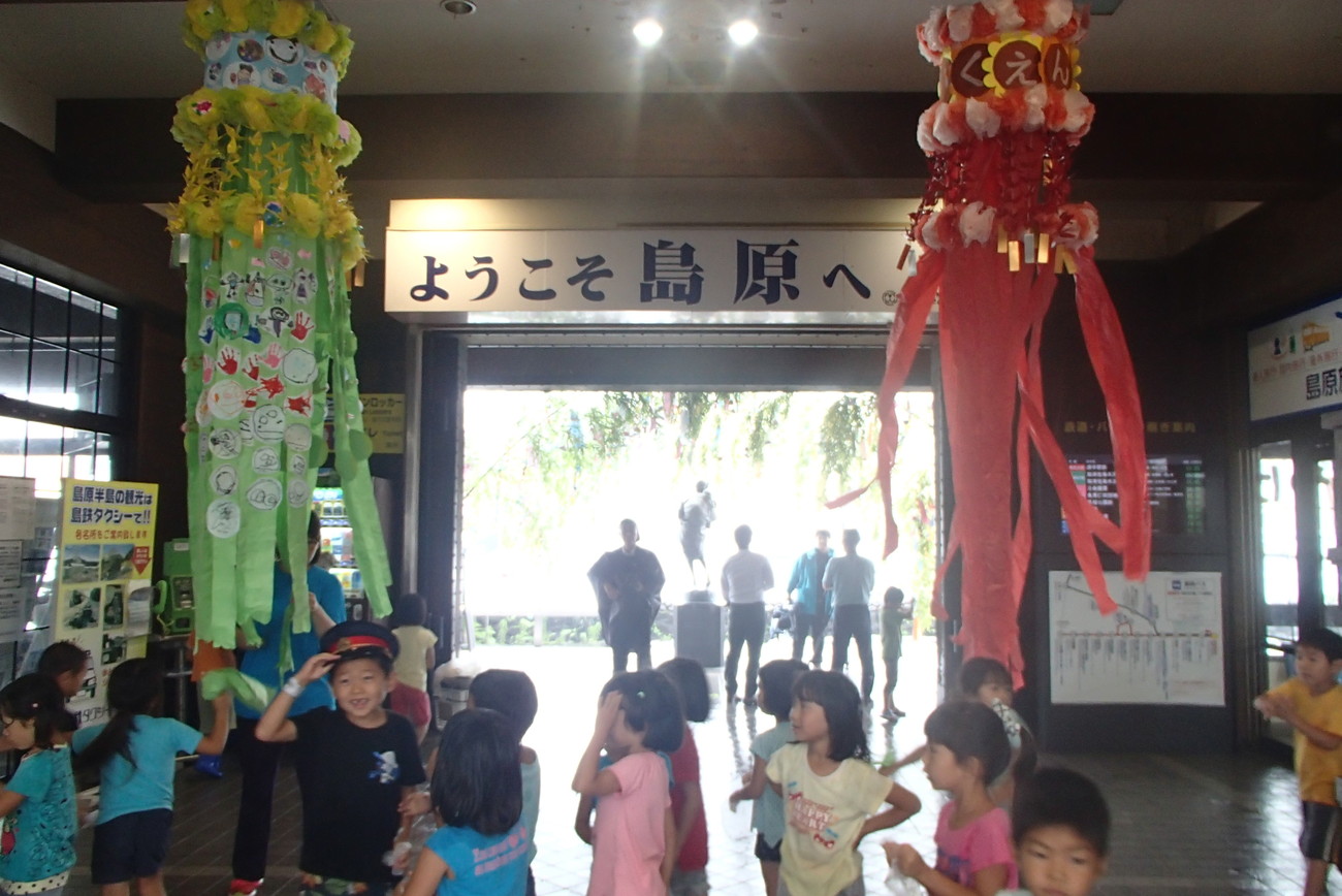 毎年あいじ保育園の年長さんと一緒に島原駅に七夕飾りをするのですが、今年は、一緒に飾り作りをしましょう!ということで、あいじ保育園の年長さん、わかくさ保育園にやってきてくれました。