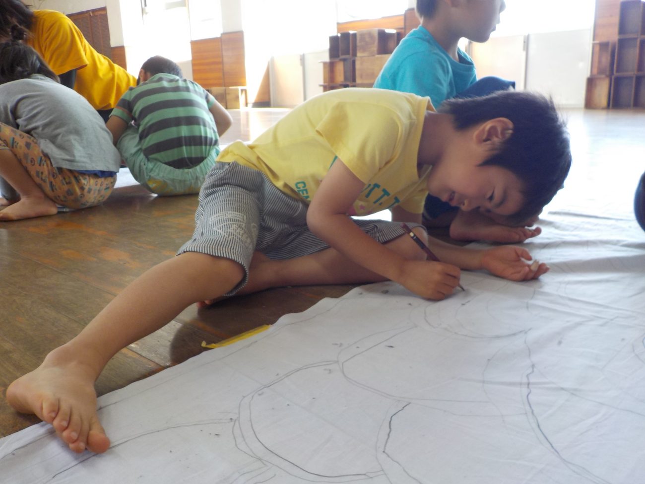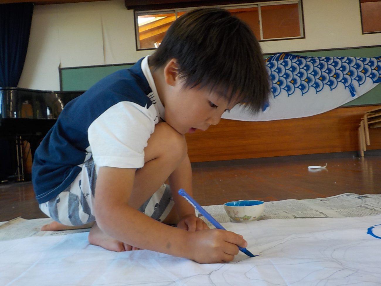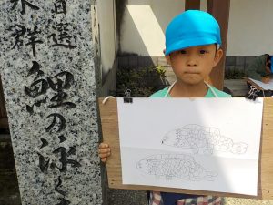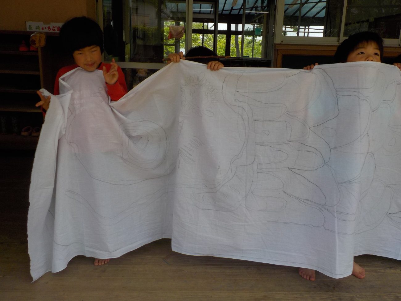 本物の鯉のぼりを見ながら えんぴつで線を描いていきます