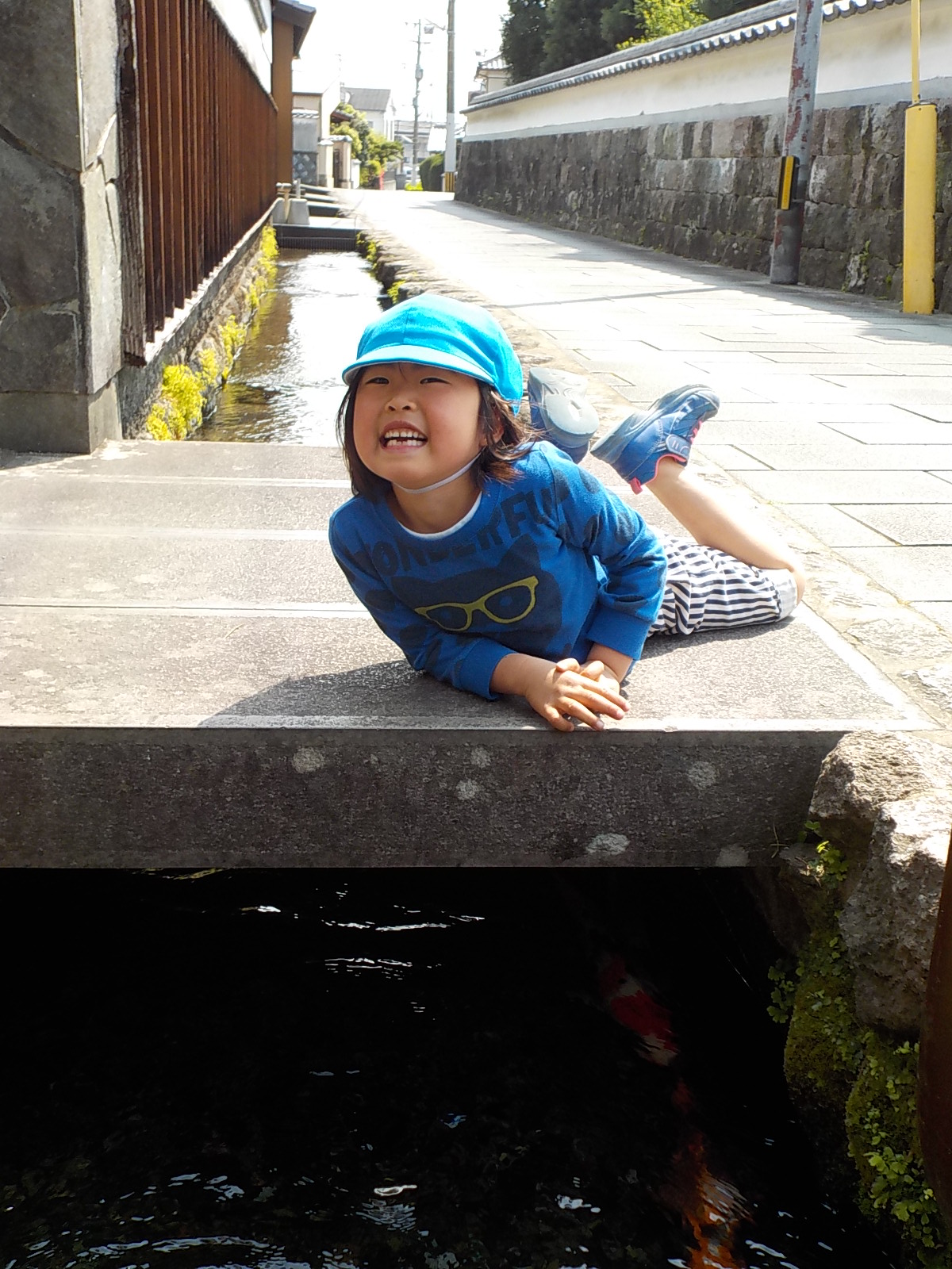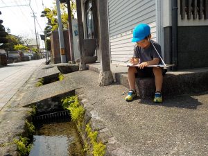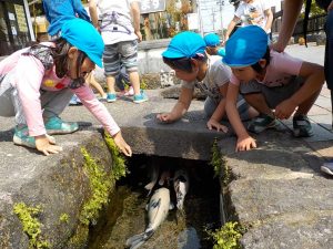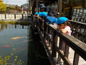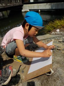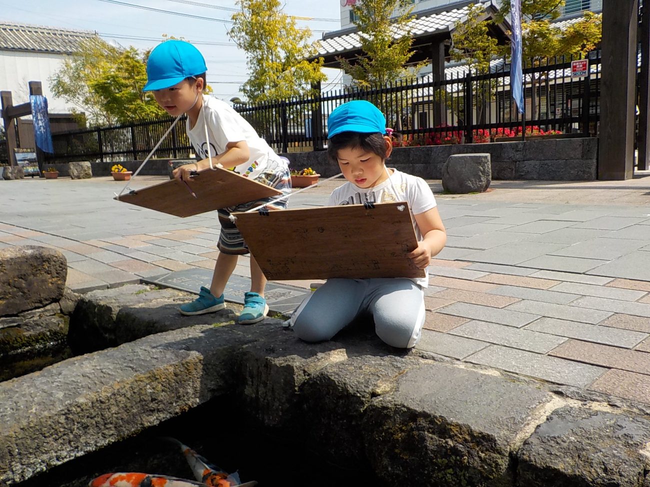 本物の鯉のぼりを見ながら えんぴつで線を描いていきます