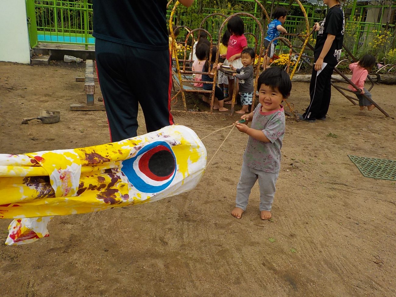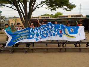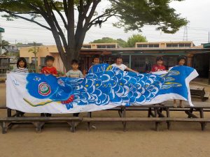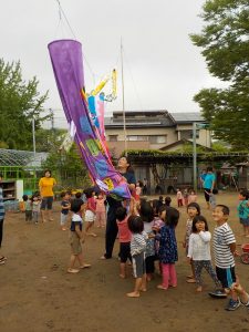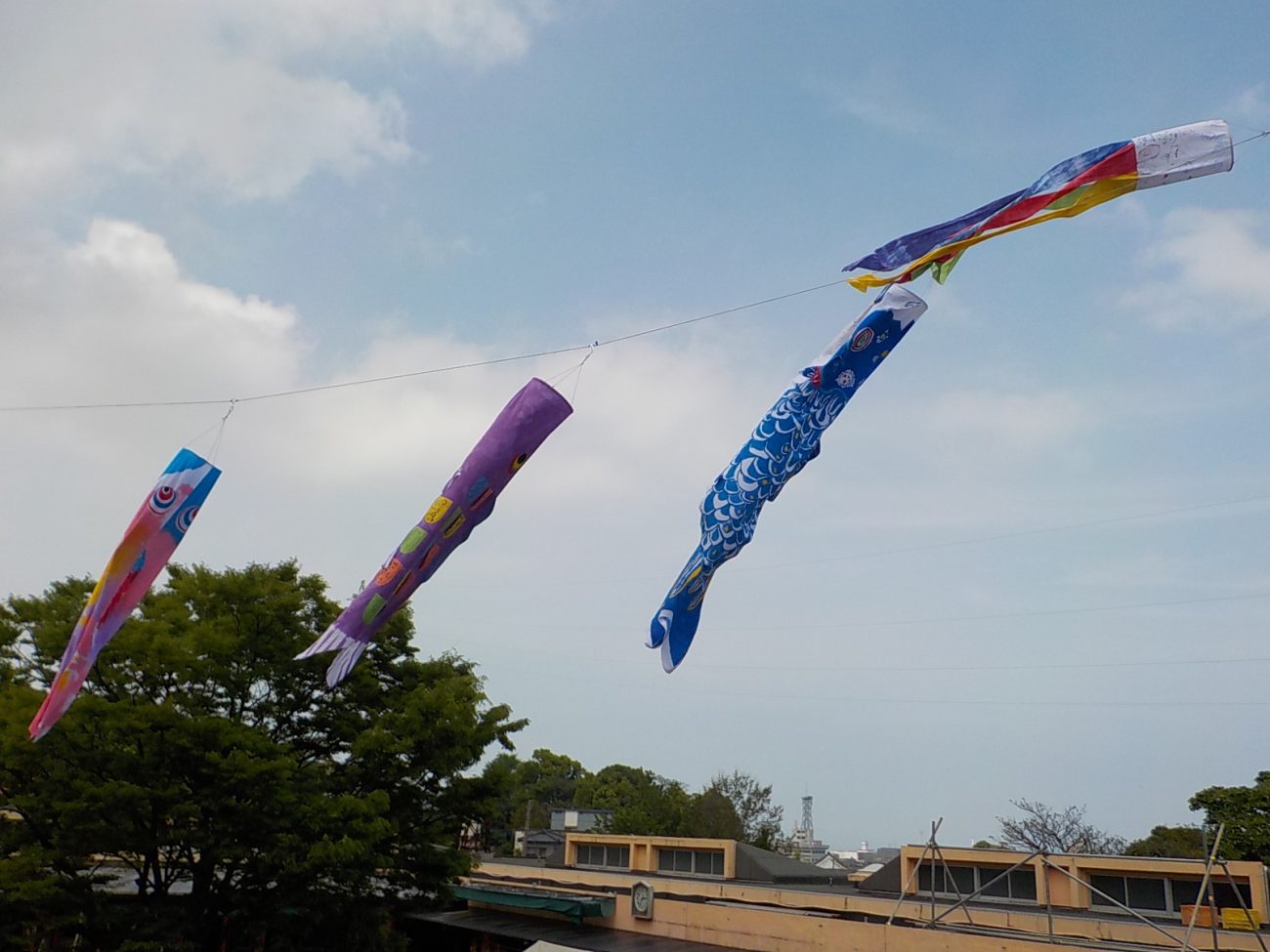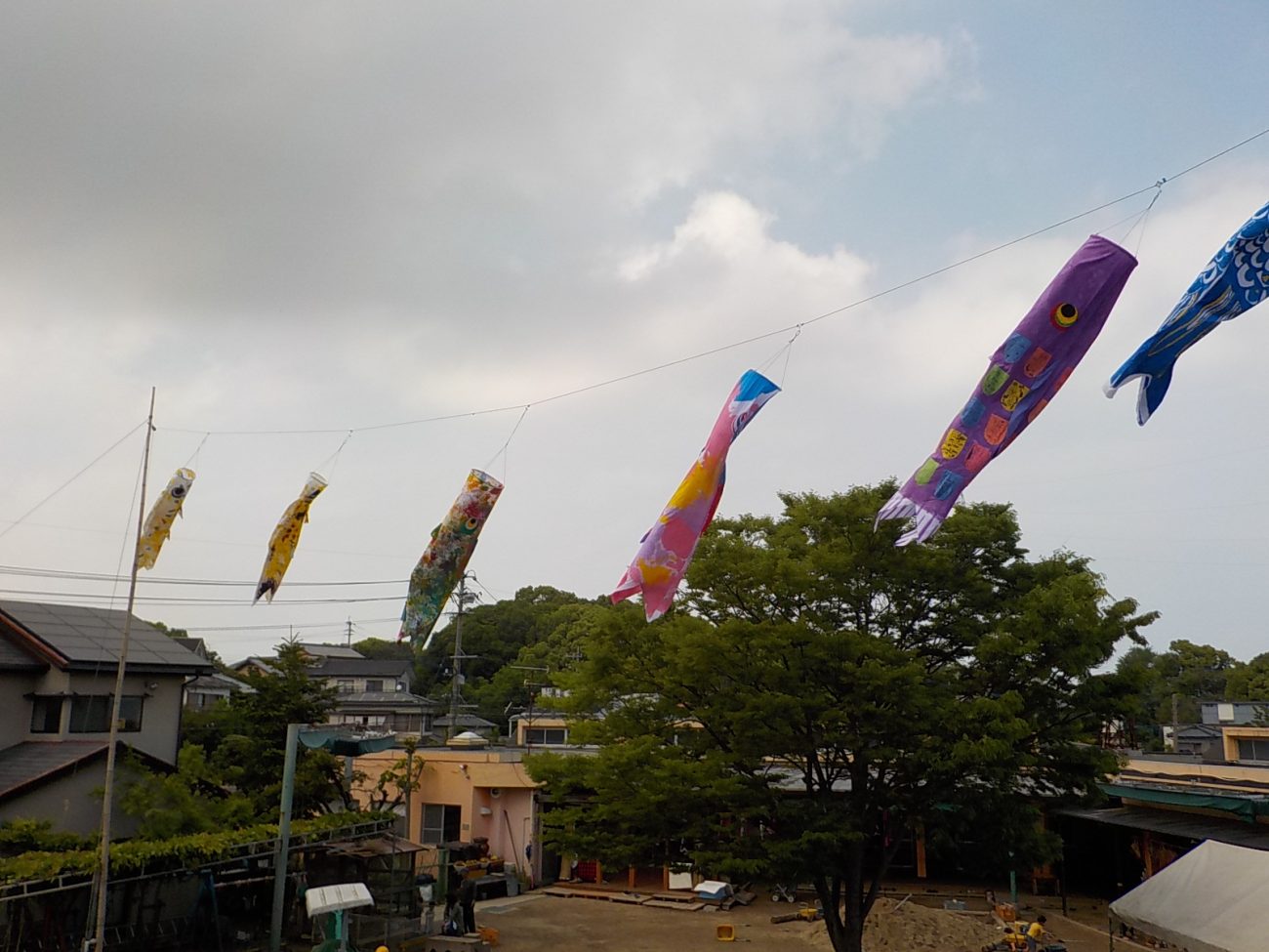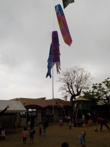 さあ いよいよこいのぼりを上げましょう 下のクラスも手づくりですよ