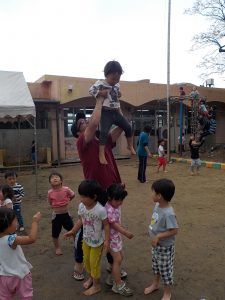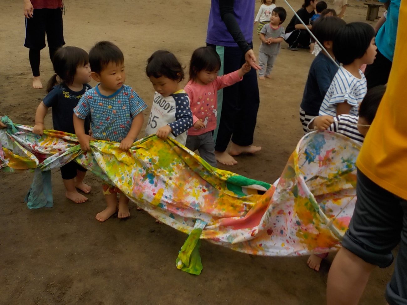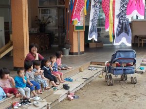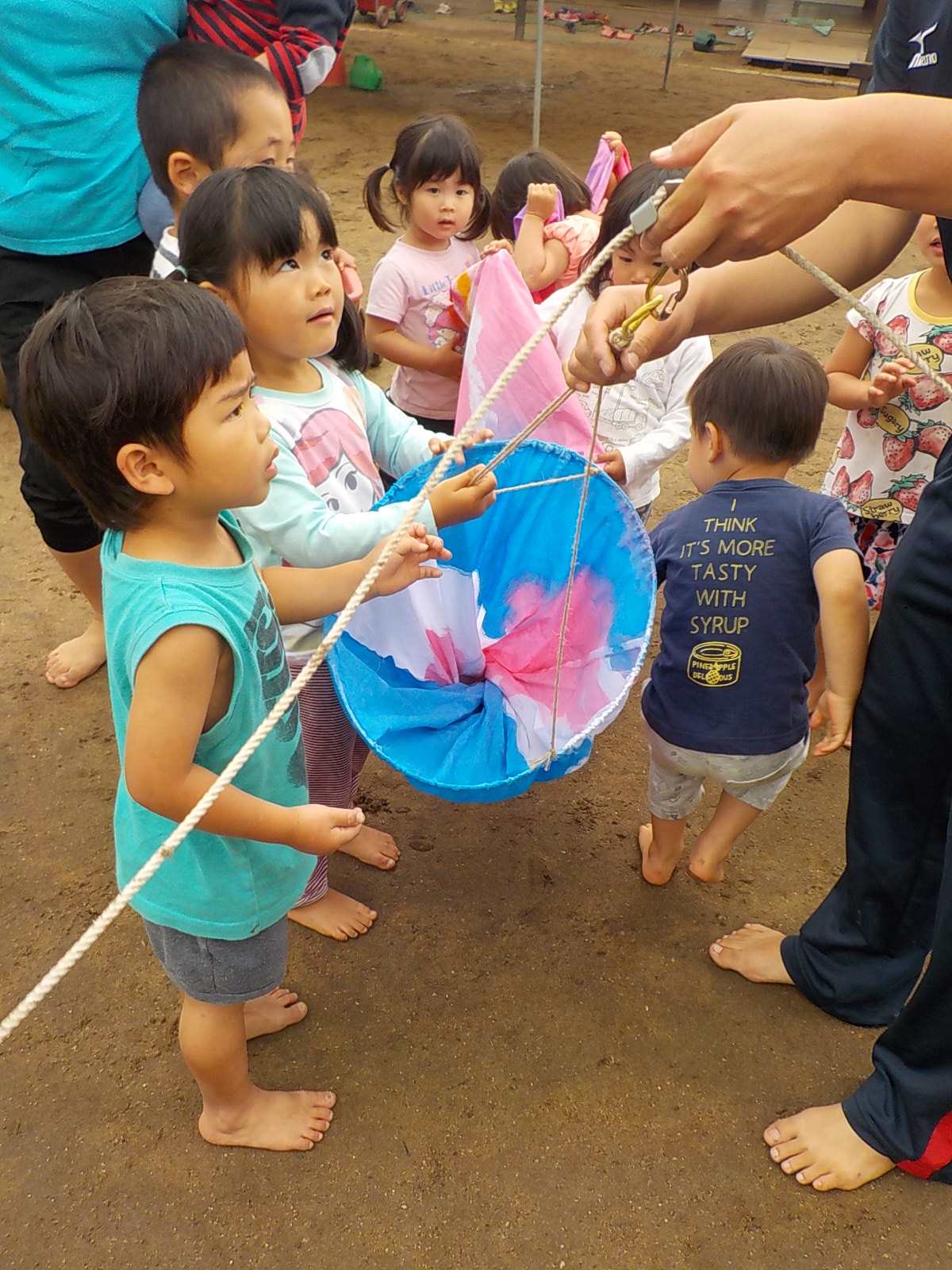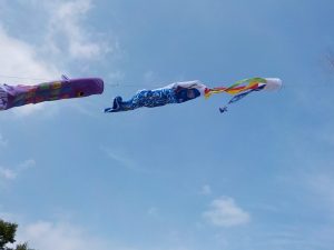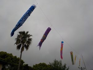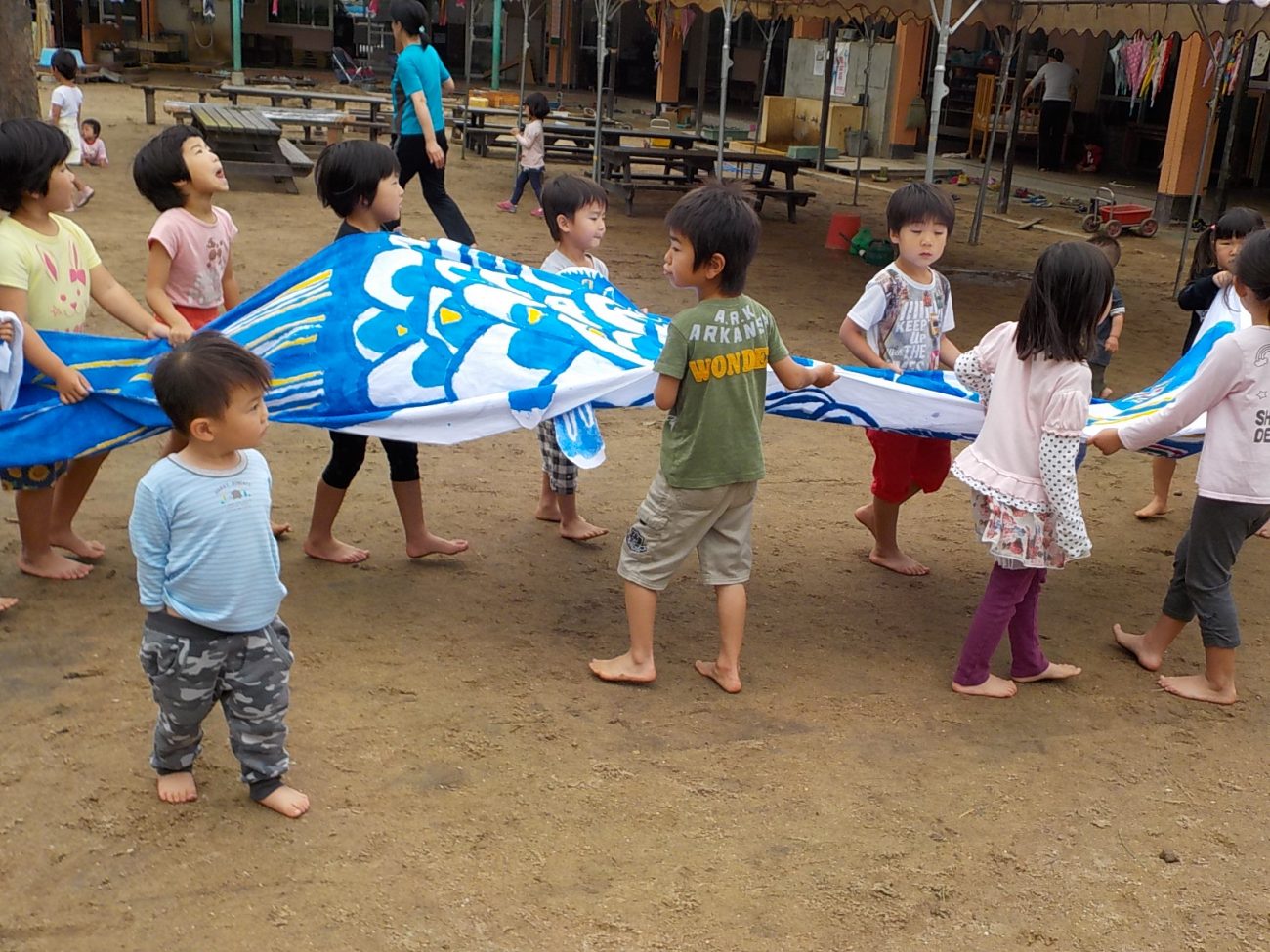 さあ いよいよこいのぼりを上げましょう 下のクラスも手づくりですよ