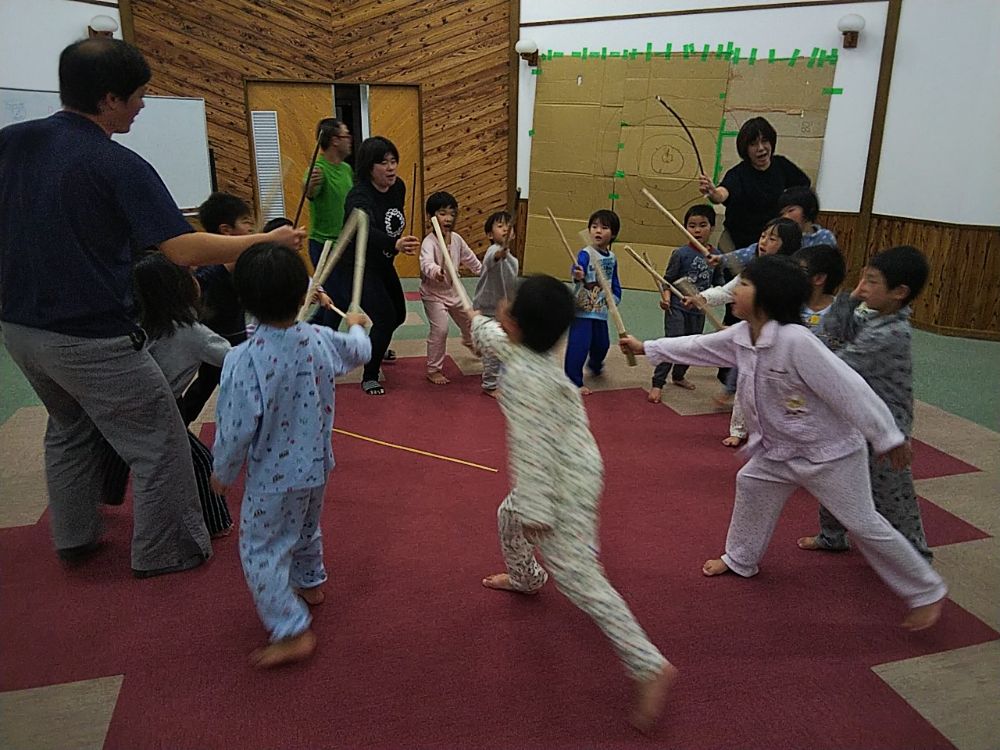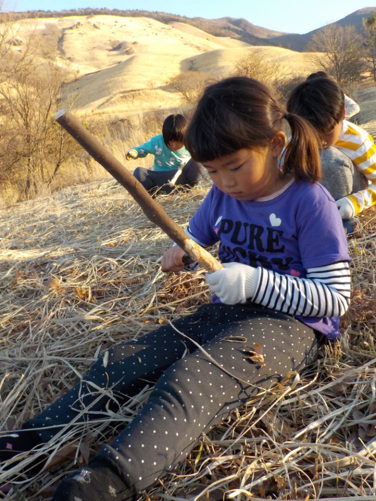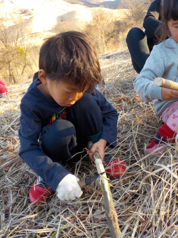 夕方 自然の家に帰ってから 木の枝の皮を削り 剣を作りました