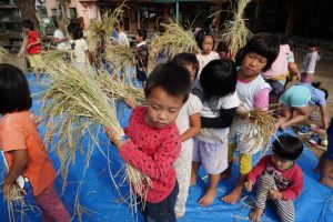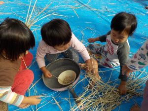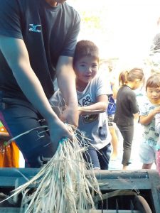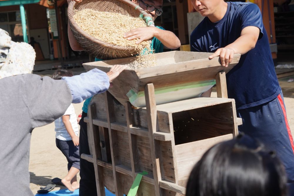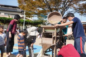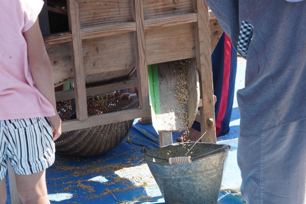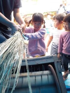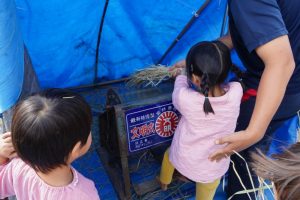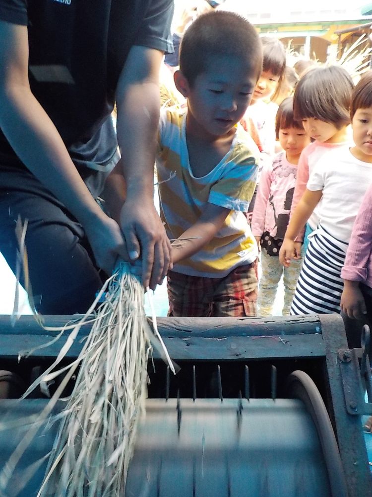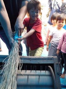 ドラムについている針金のようなものが稲にあたって お米が飛び散ります