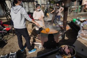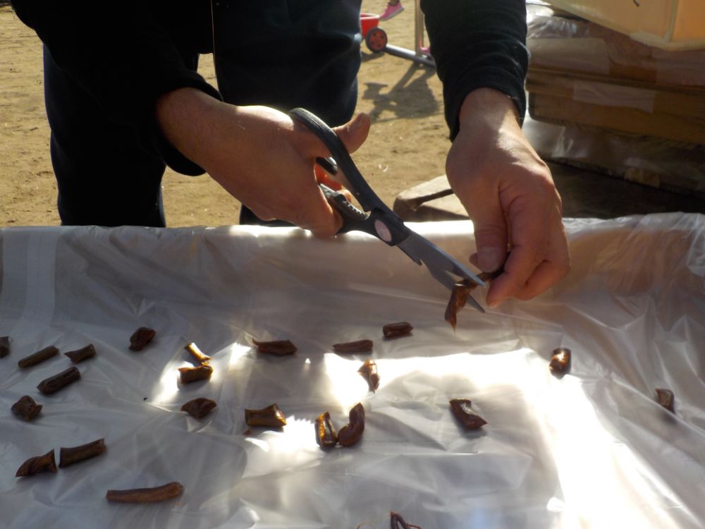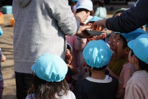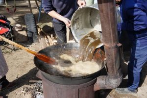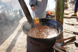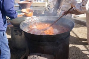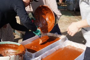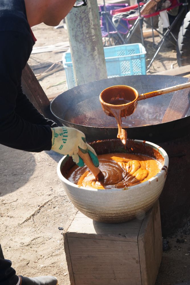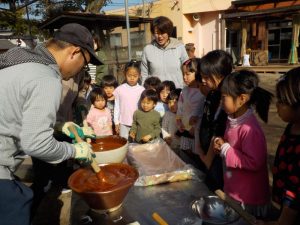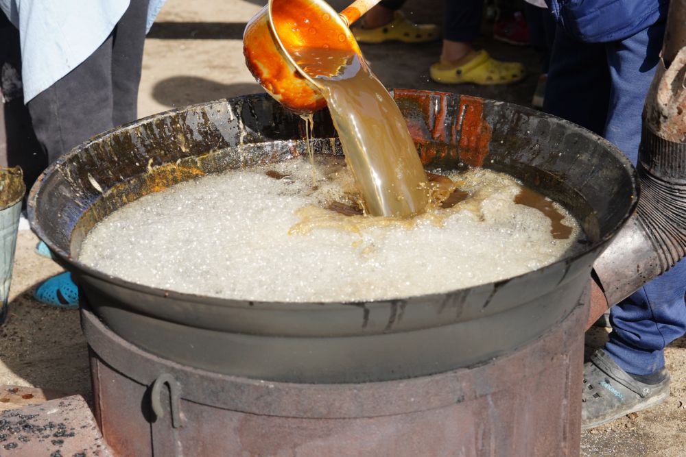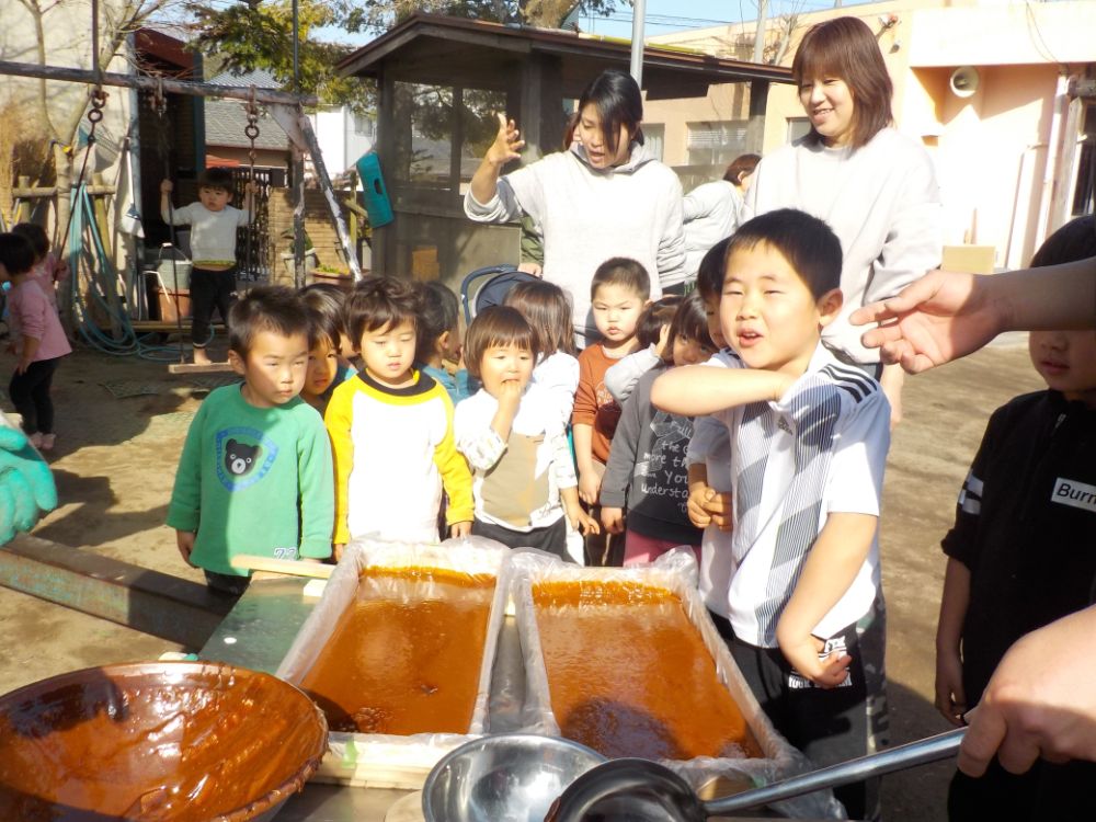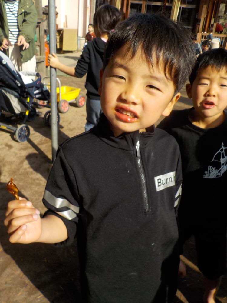しぼった汁をまた園に持ち帰り ぐつぐつと煮詰めていきます
