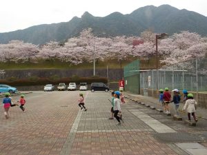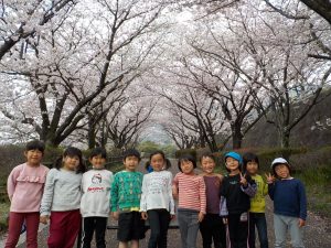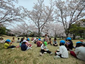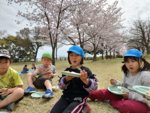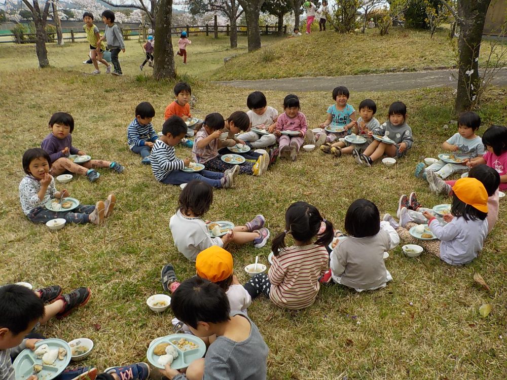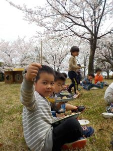 お花の下で給食 うれしいね