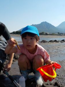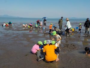 (※特別に許可をいただいて貝掘り体験をしています)