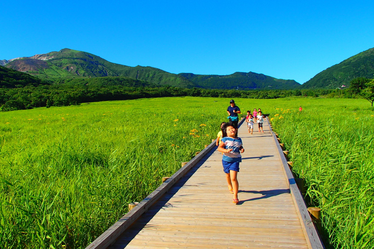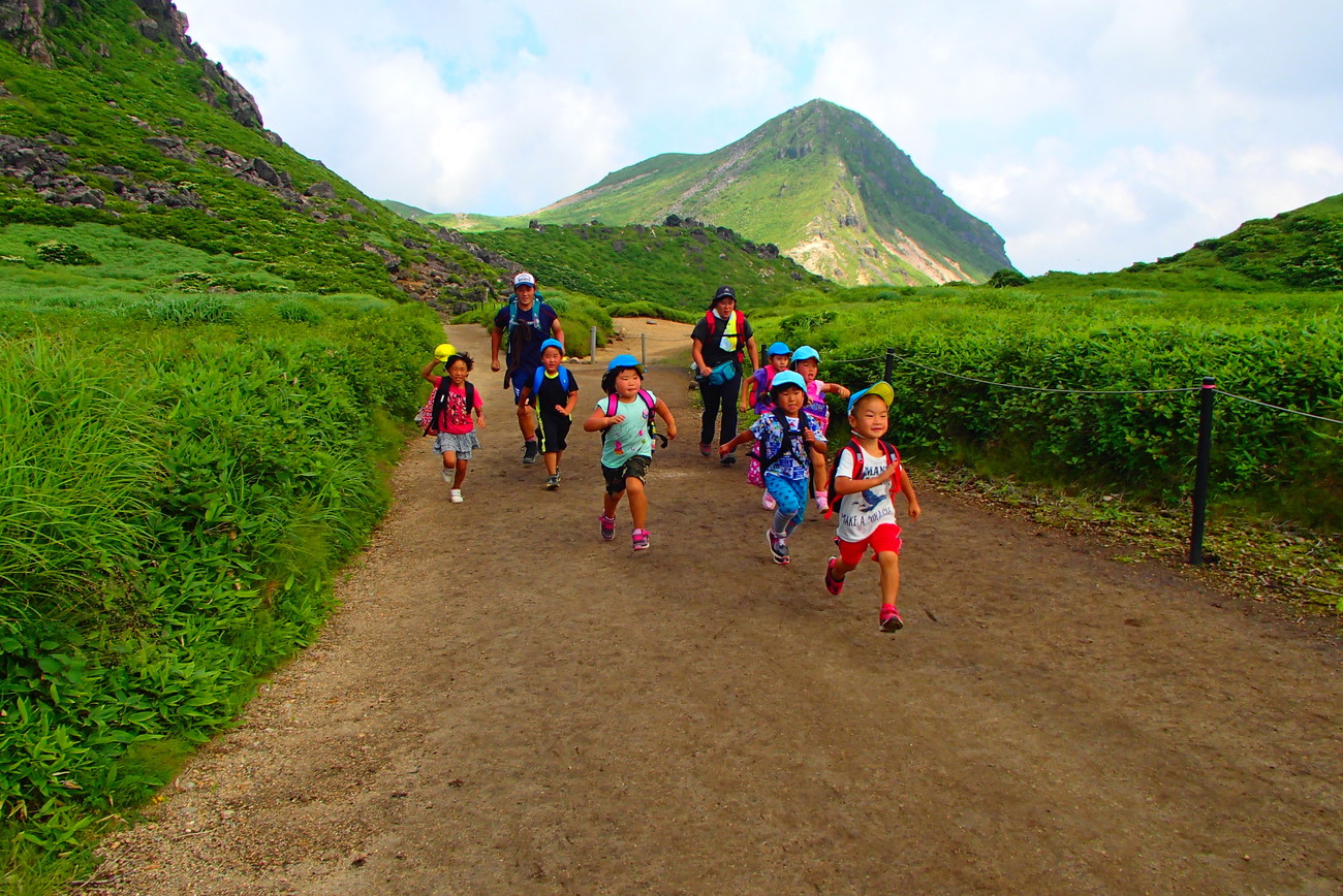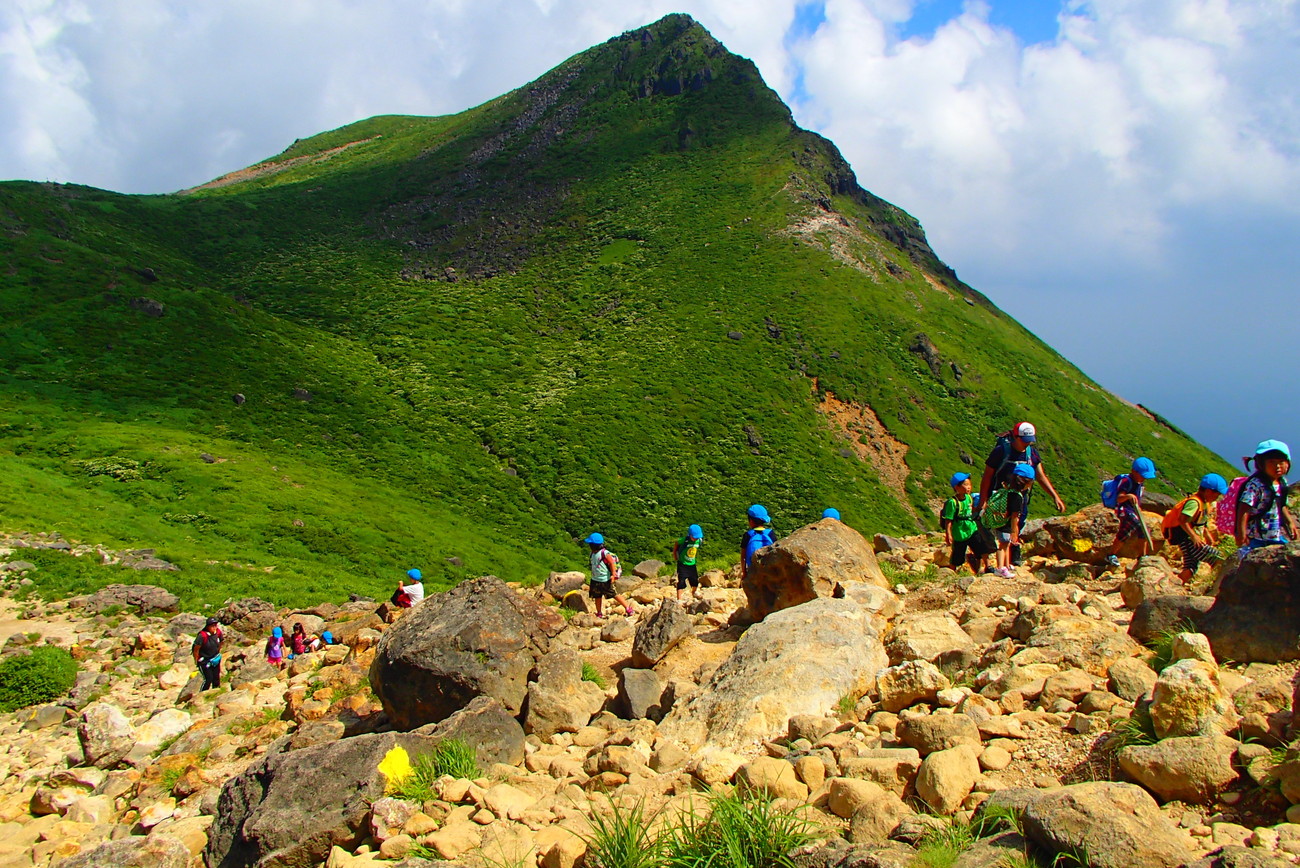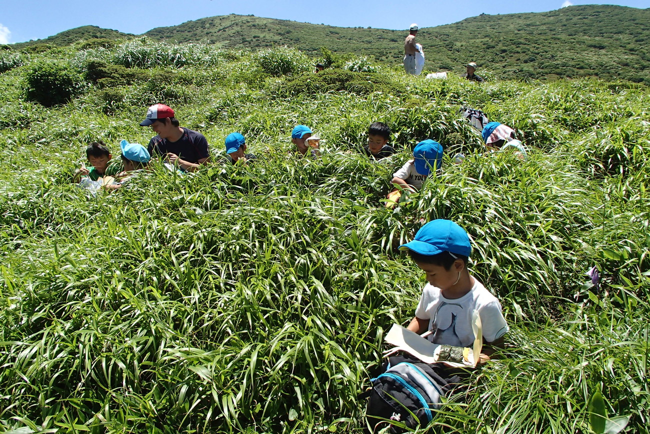 1日目は山登り。めざすは九重連山の主峰、久住山! 準備体操はできたかな?