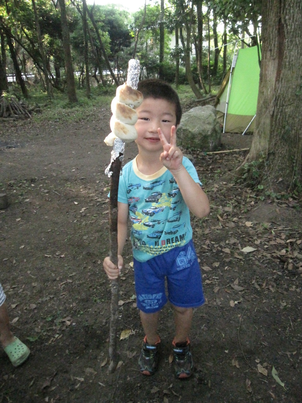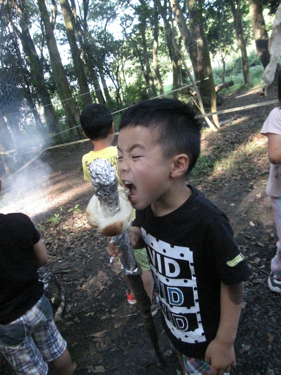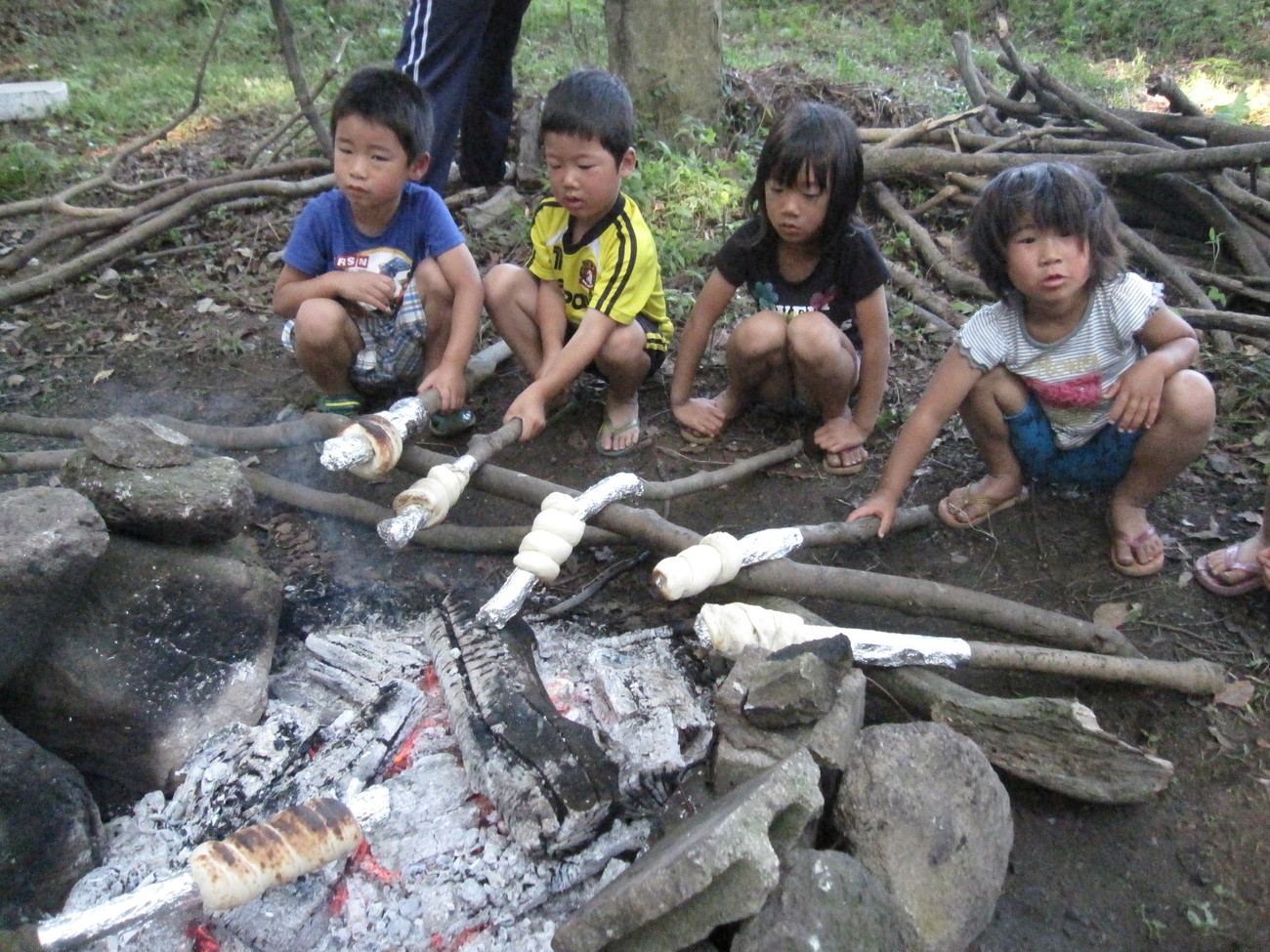棒にくるくる巻きつけているのは何でしょう?今日の朝ごはんのパンですよ。