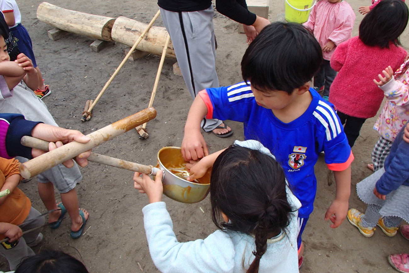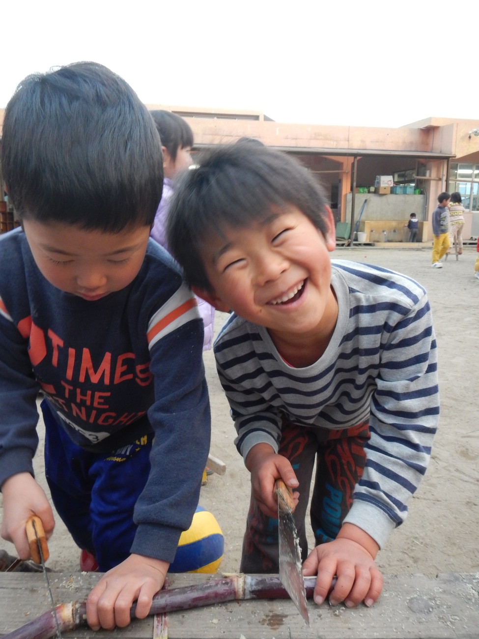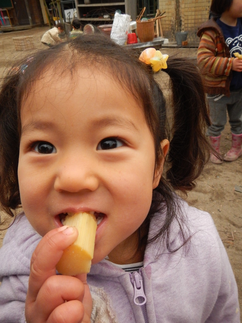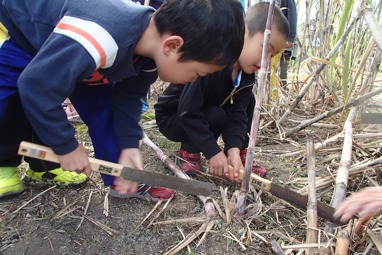 保育園の畑で育ったサトウキビから黒砂糖づくりをしましたよ。