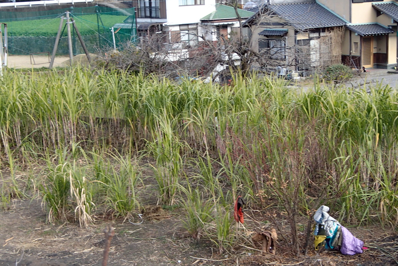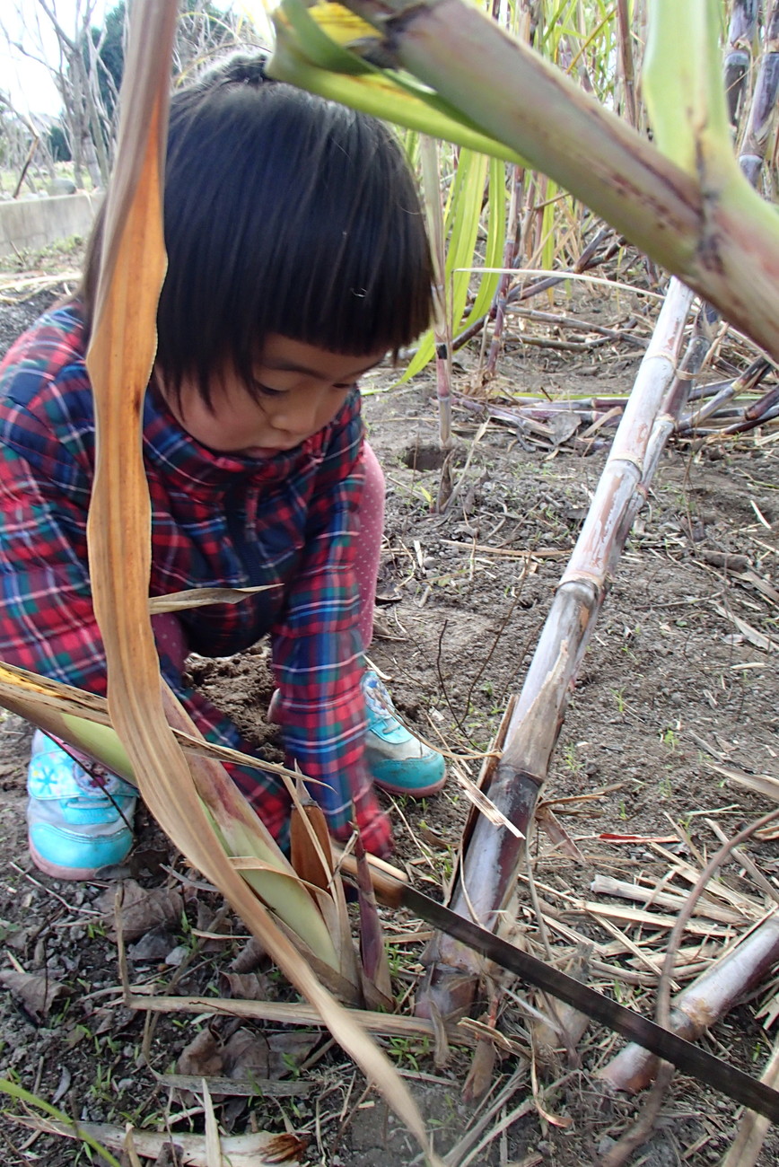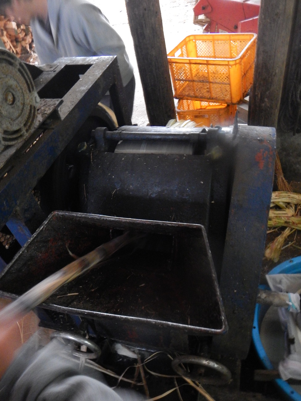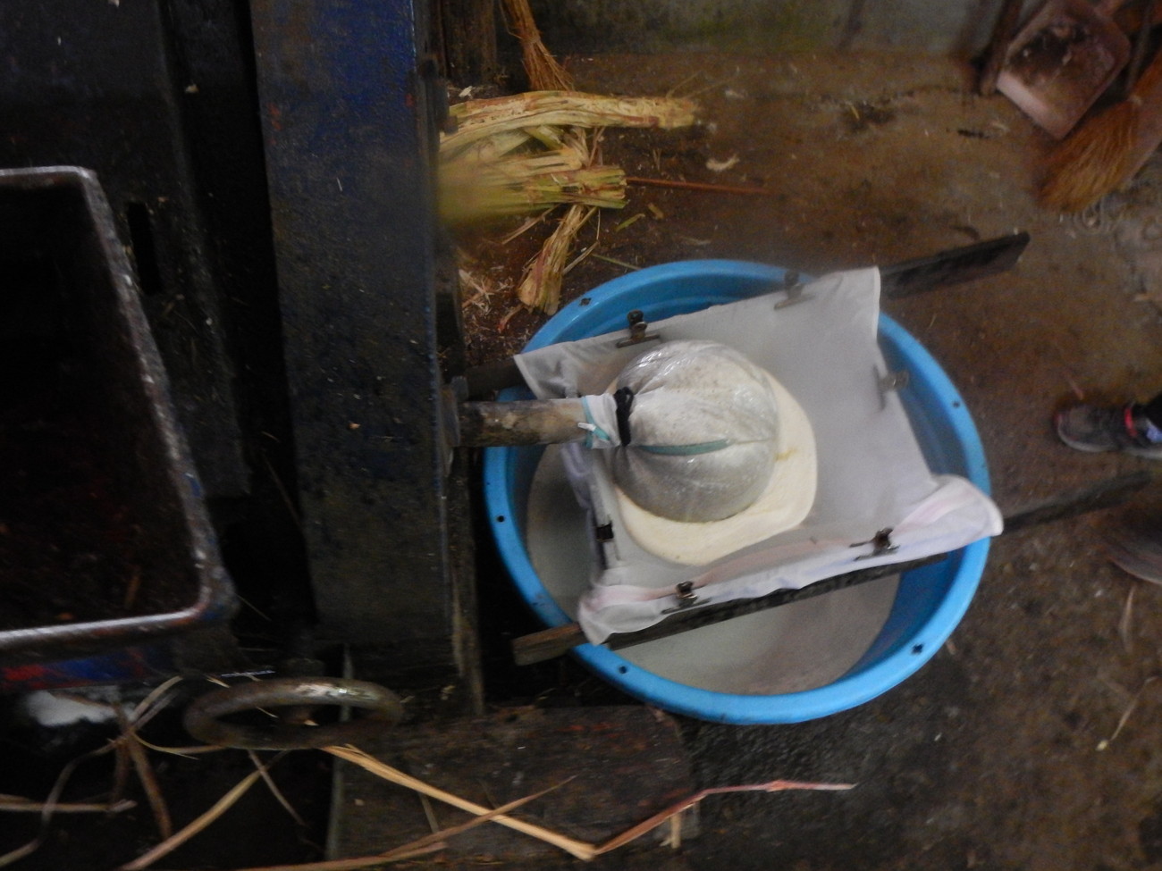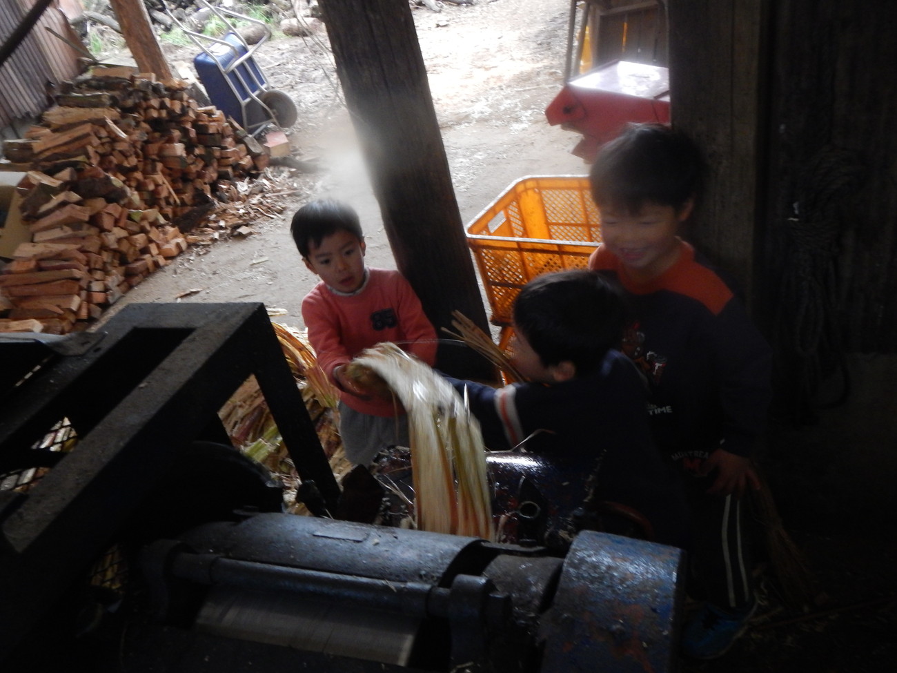 北有馬のサトウキビを絞る機械をもっているおじいさんの家まで運んで、絞らせてもらいました。