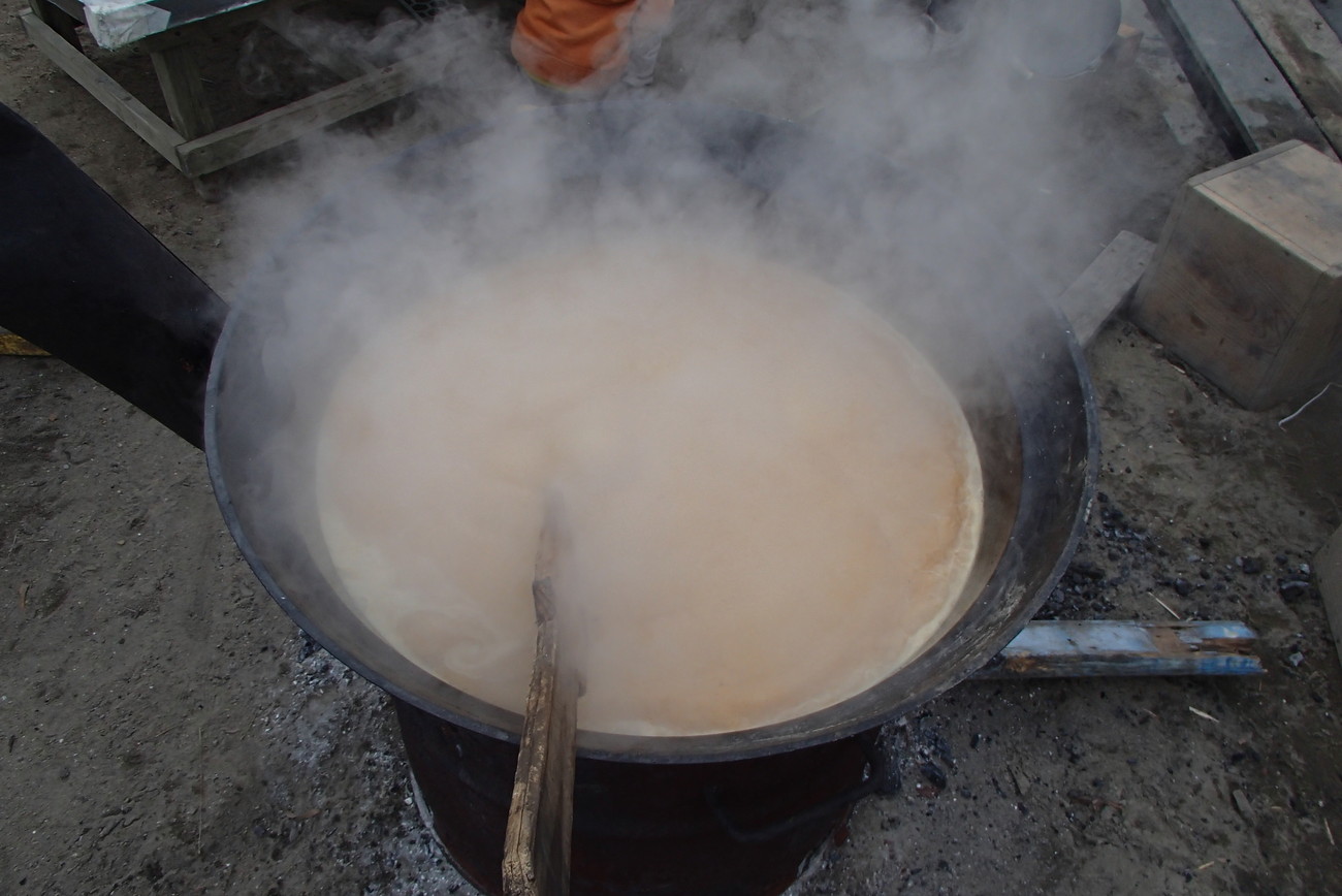 絞られた汁が帰ってきました。おおきなお釜でひたすらぐつぐつ煮込みます。