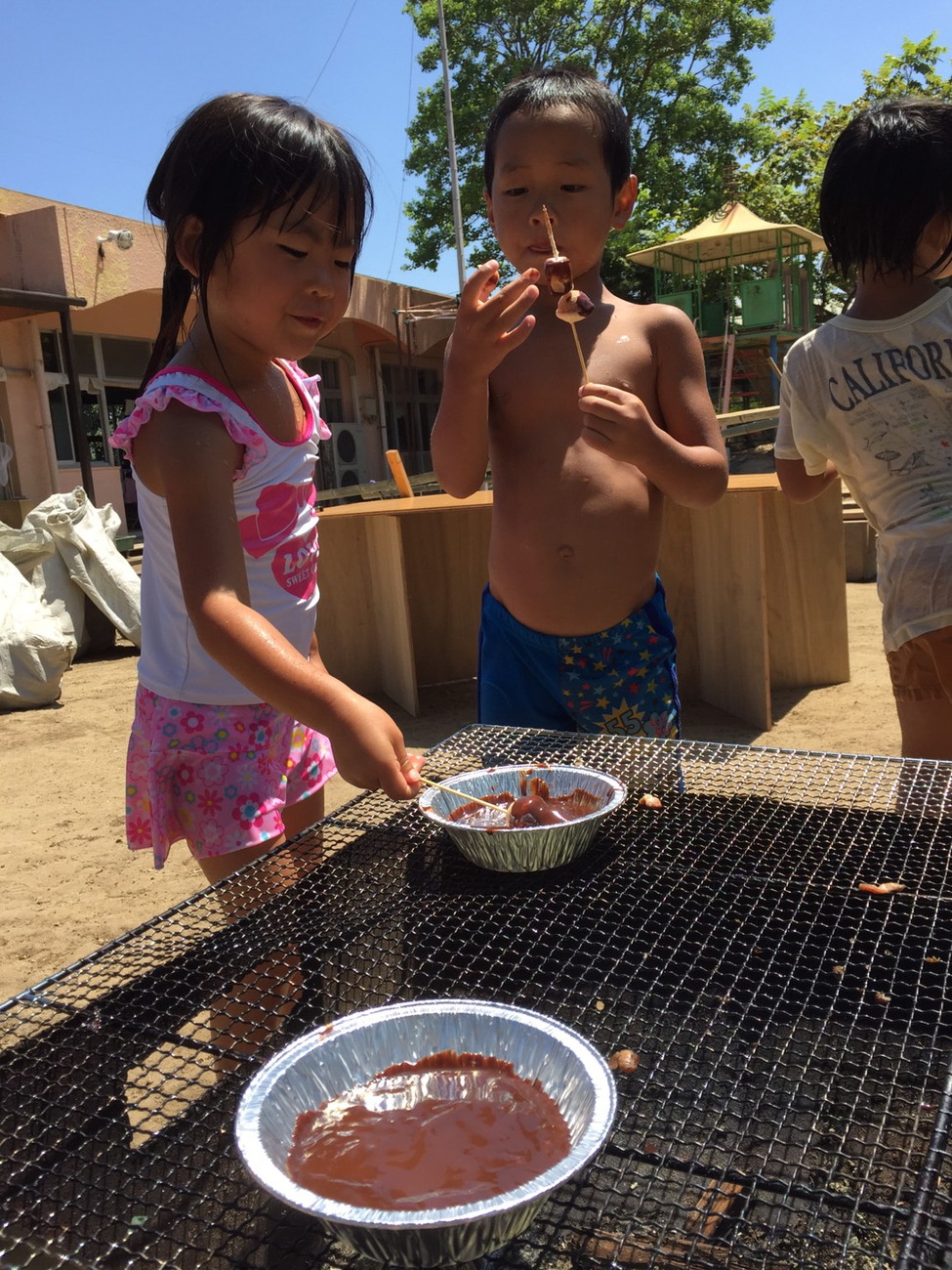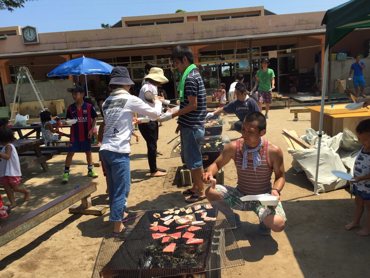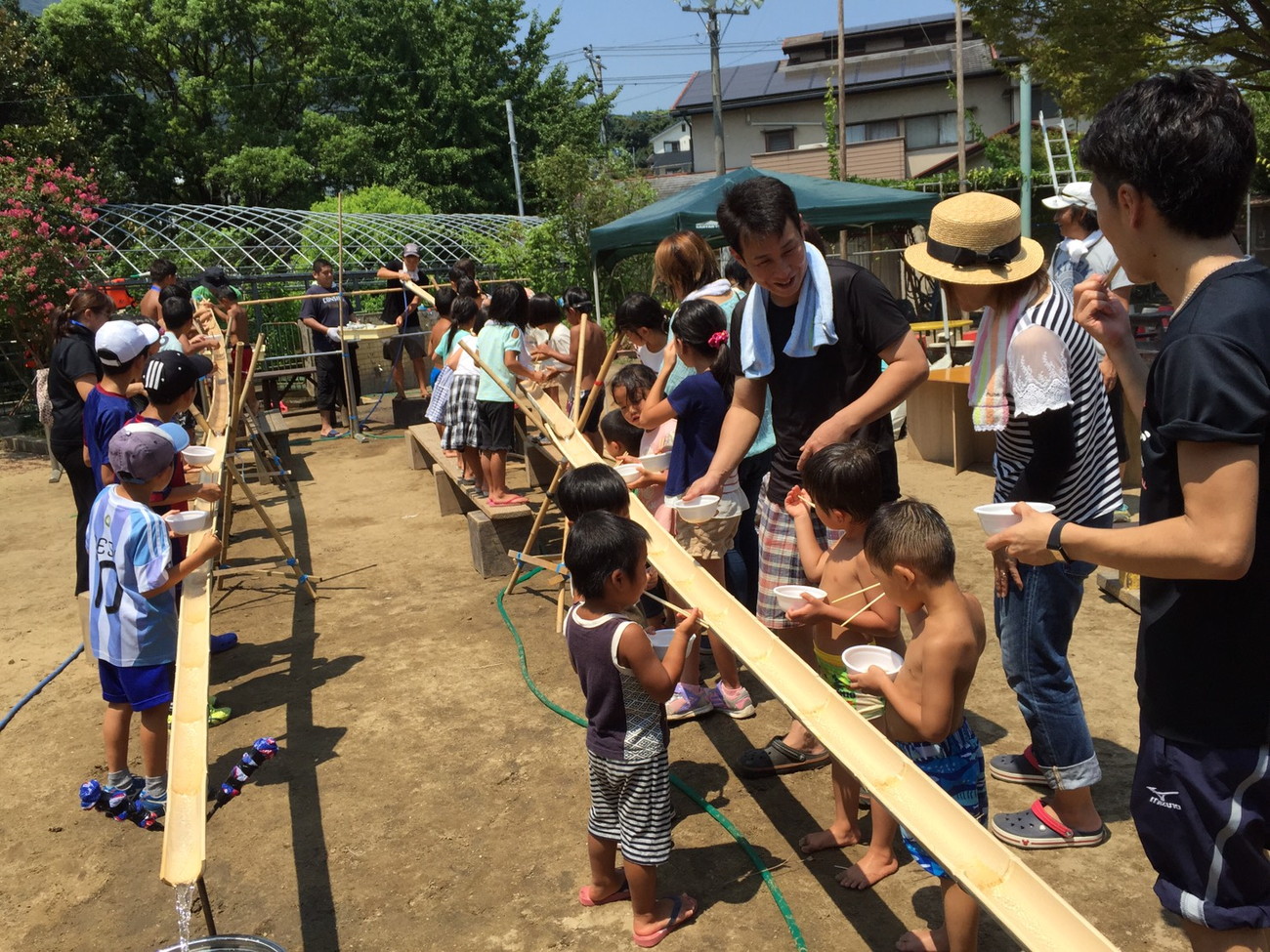 朝からお父さんたちが竹を裂いてそうめん流しの準備をしてくれました。
