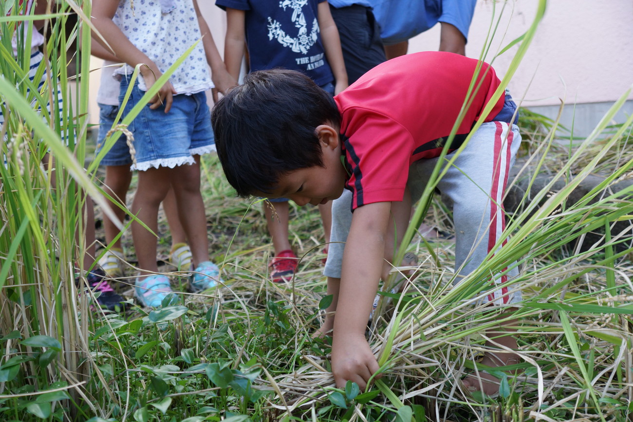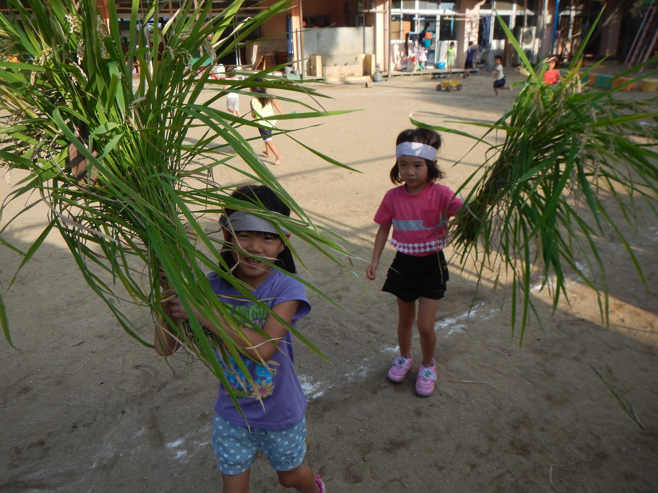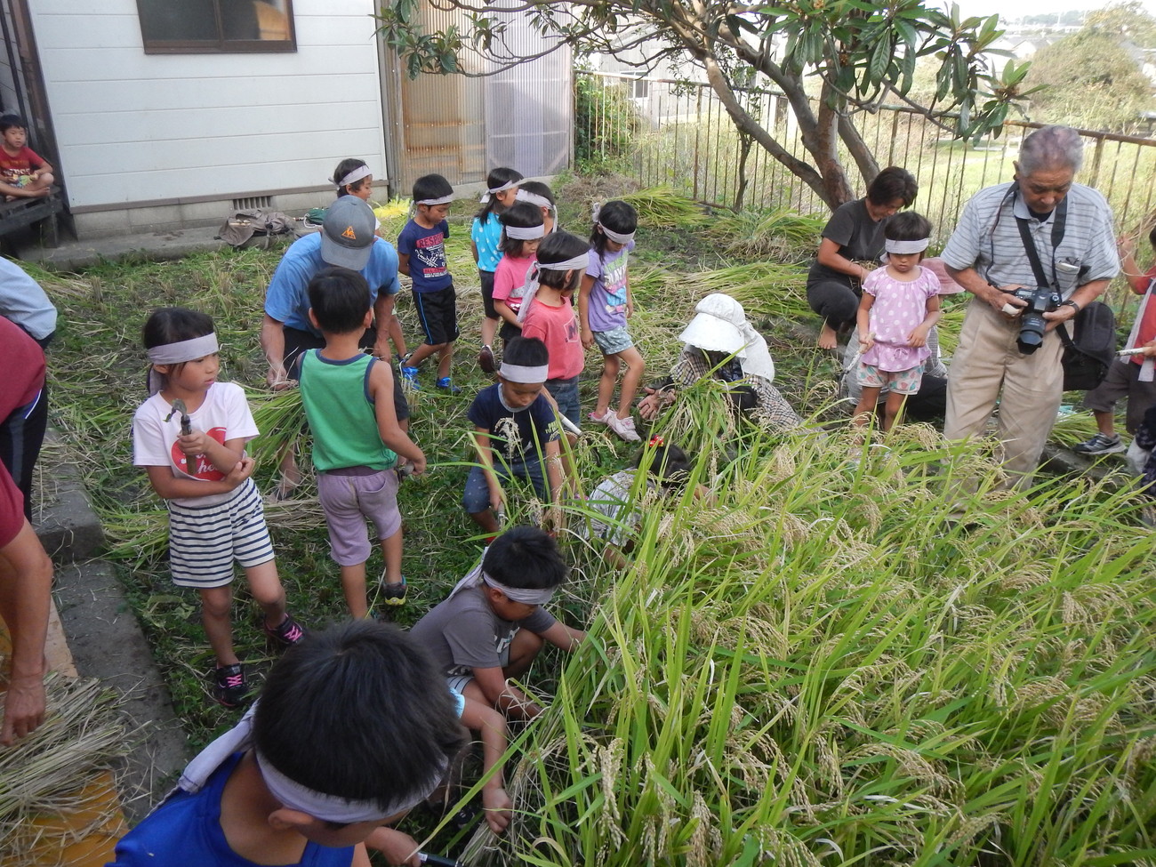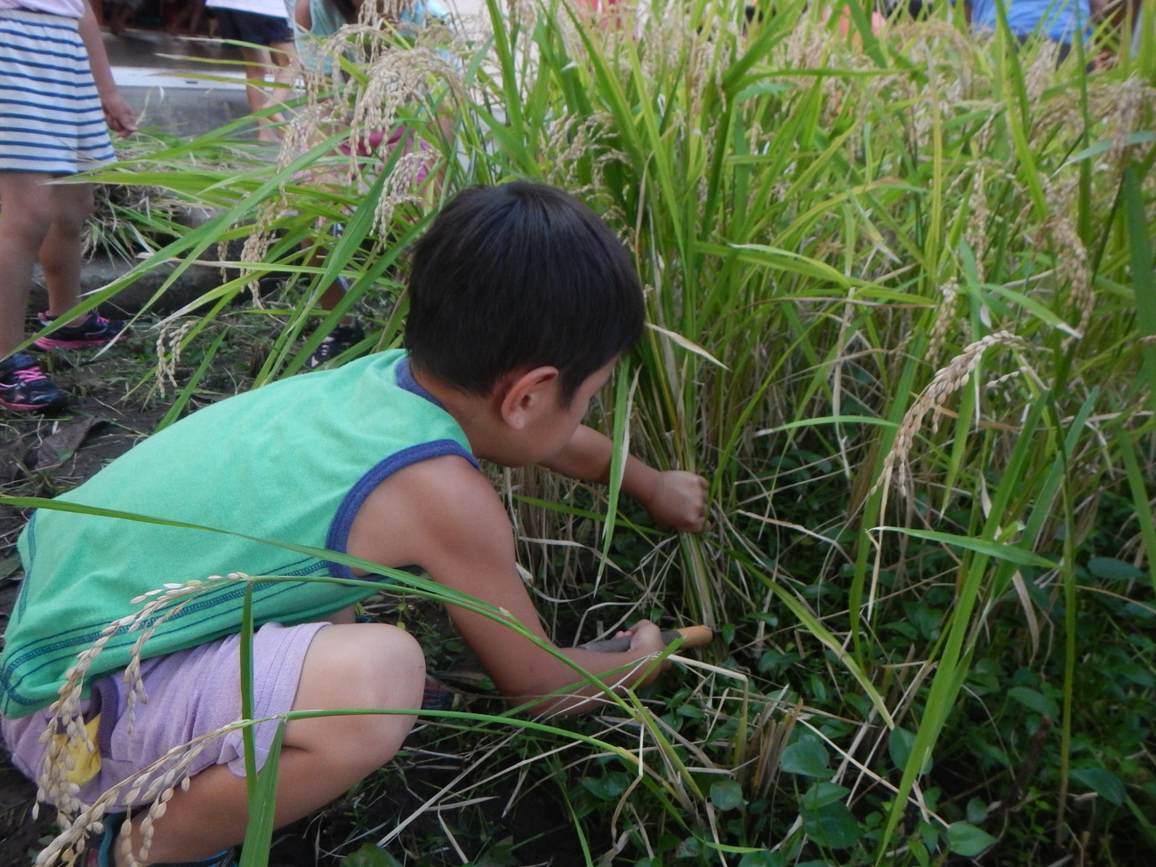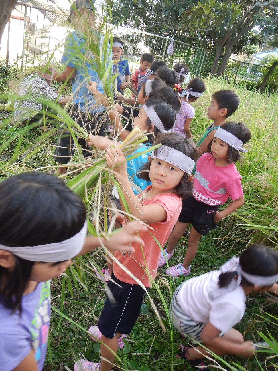 今日は稲刈りです。ぞうぐみさん、きりんぐみさんが鎌で稲を刈っていきます。