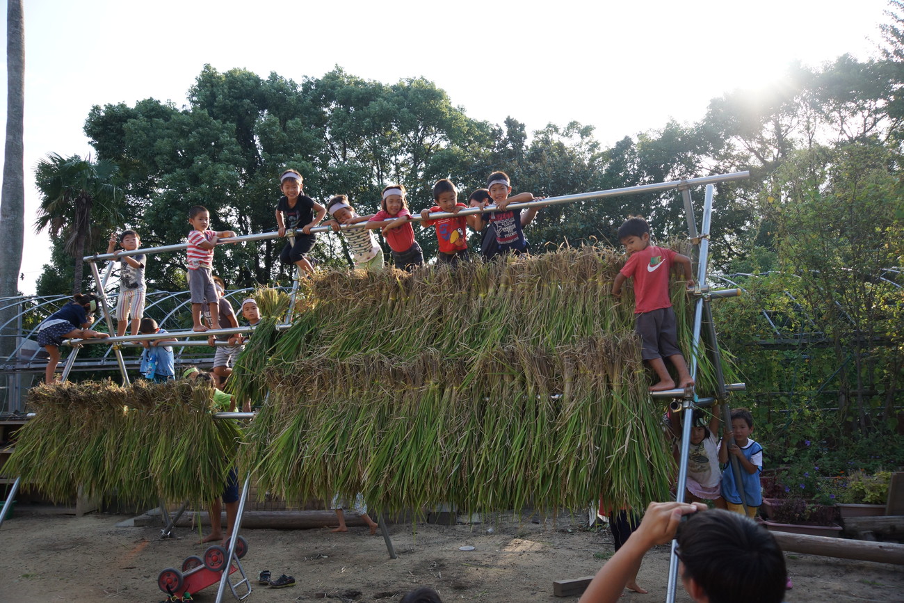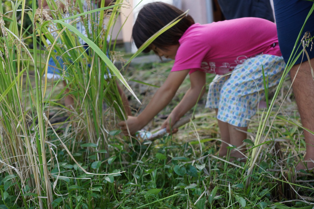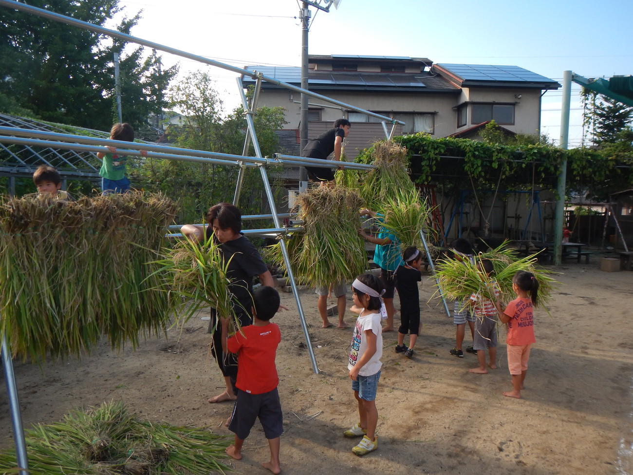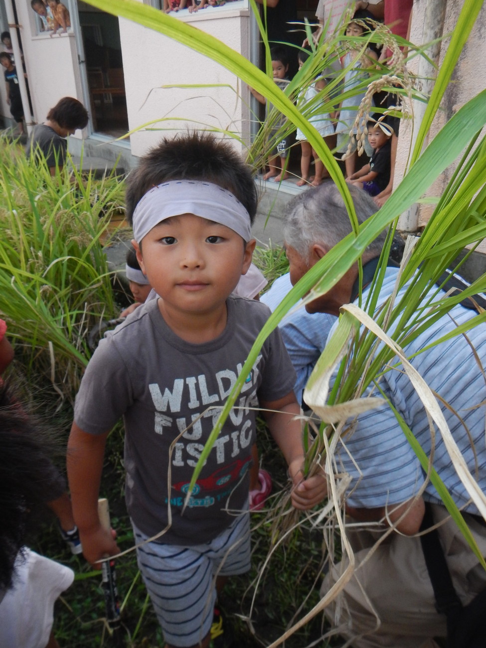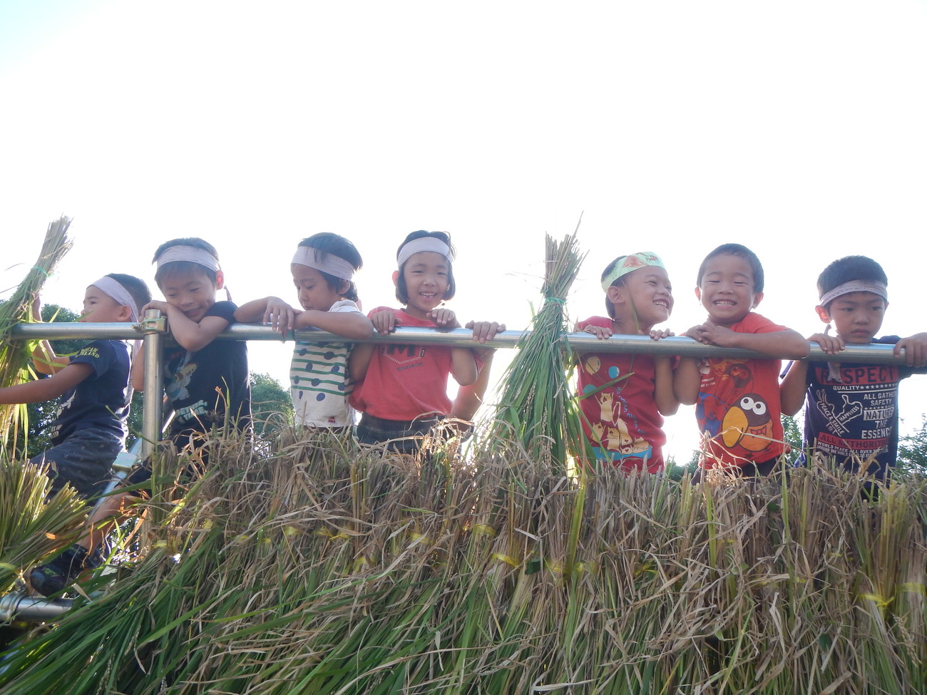 今日は稲刈りです。ぞうぐみさん、きりんぐみさんが鎌で稲を刈っていきます。