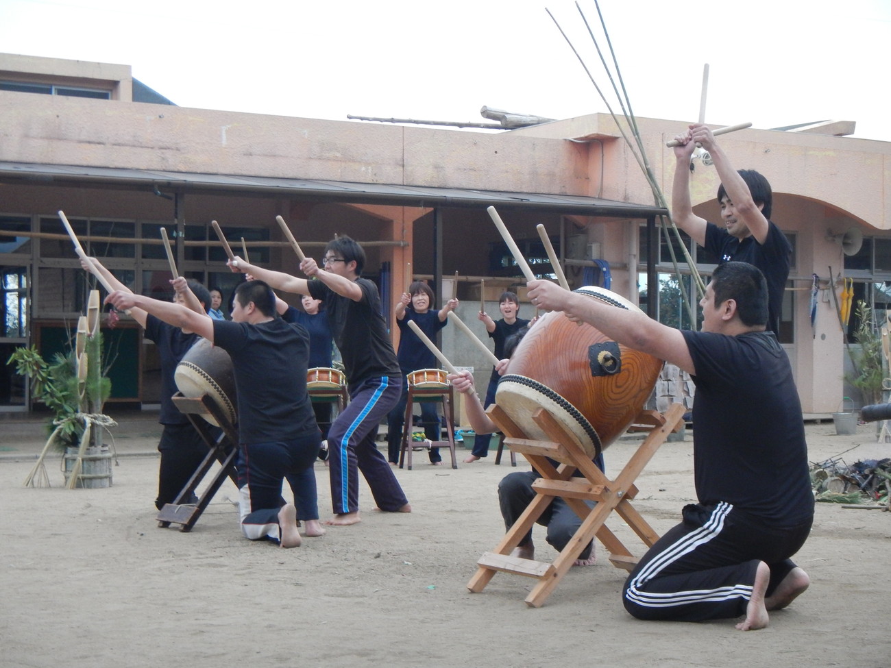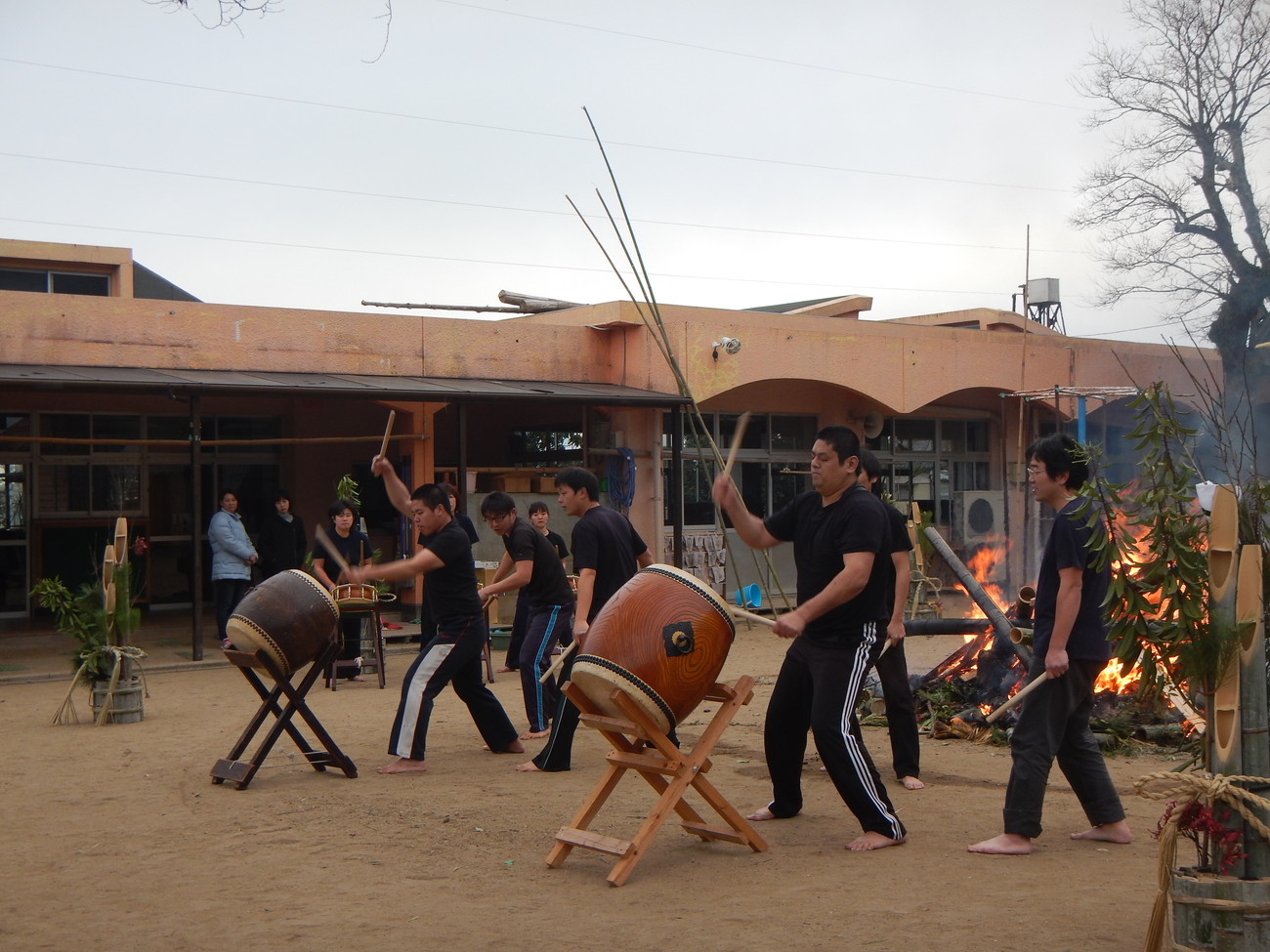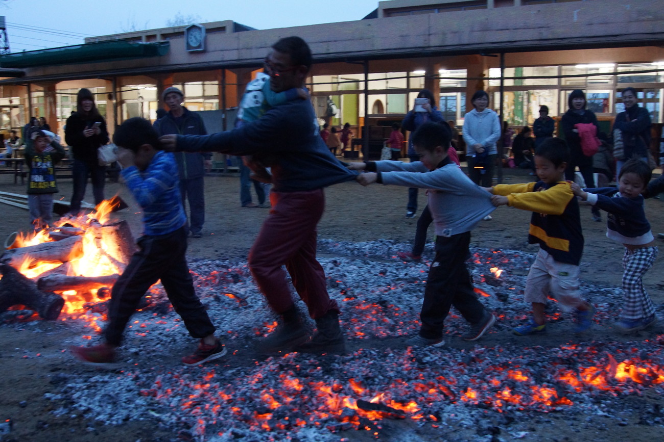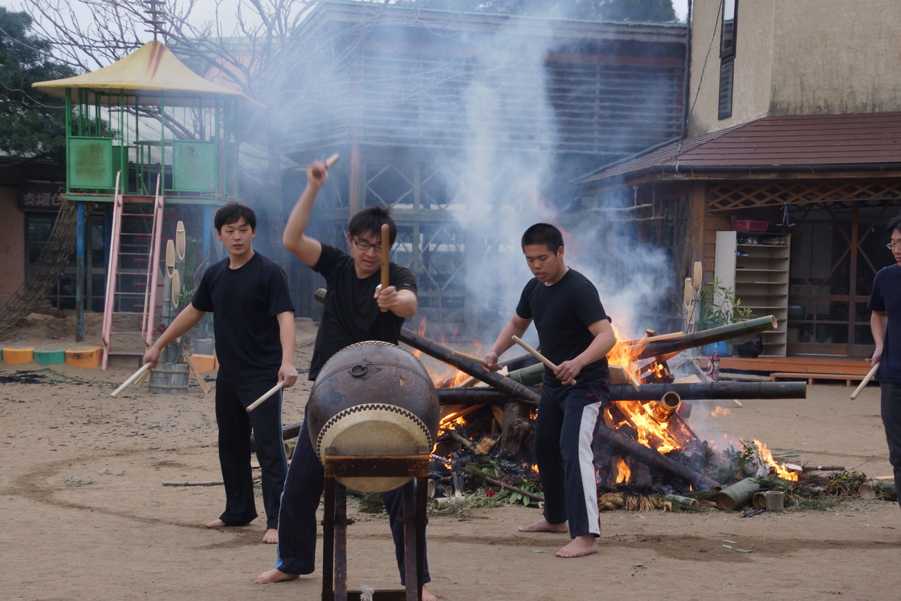 鬼火をバックに男性職員と父親による ぶちあわせ太鼓