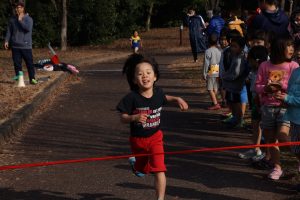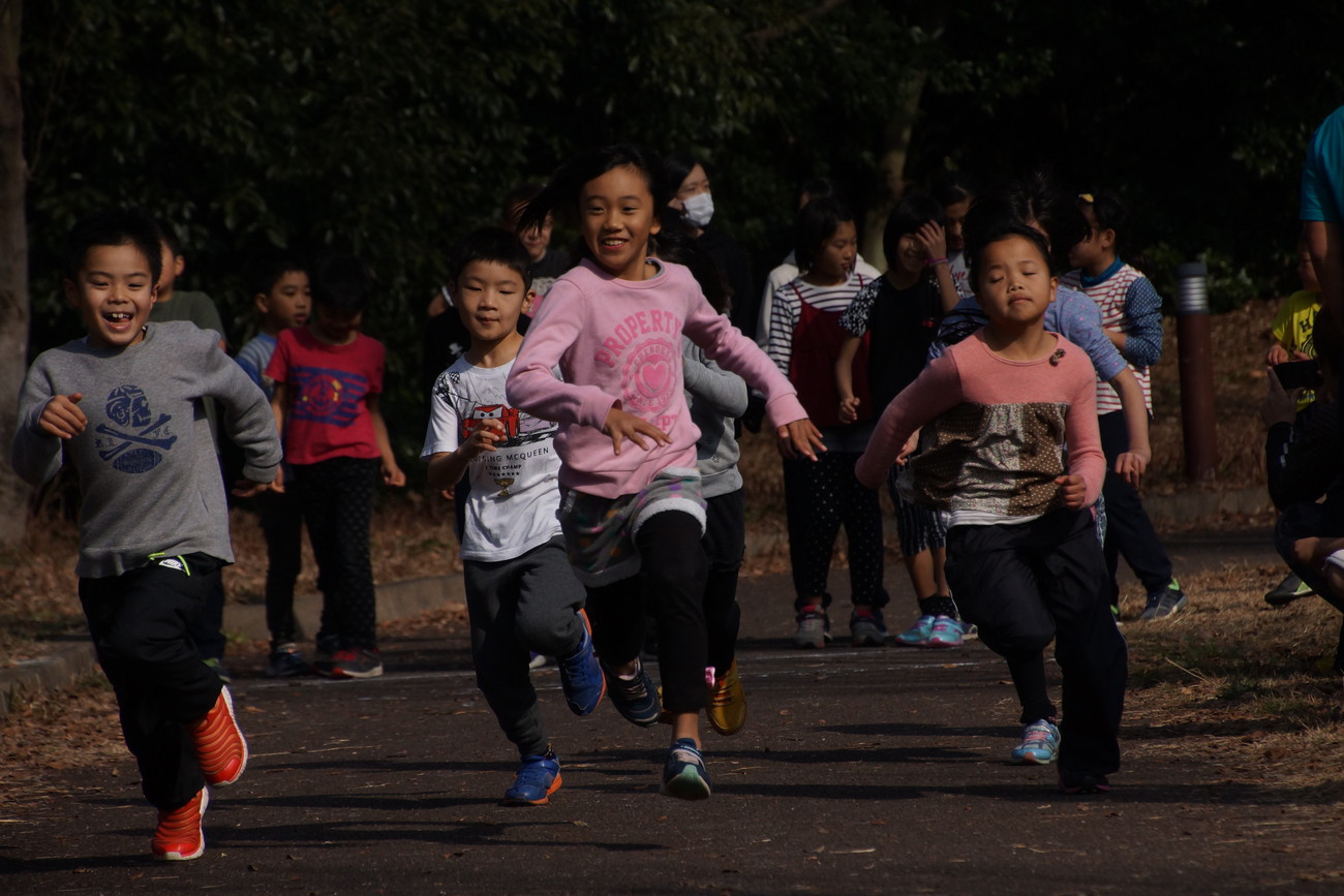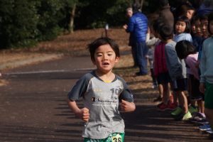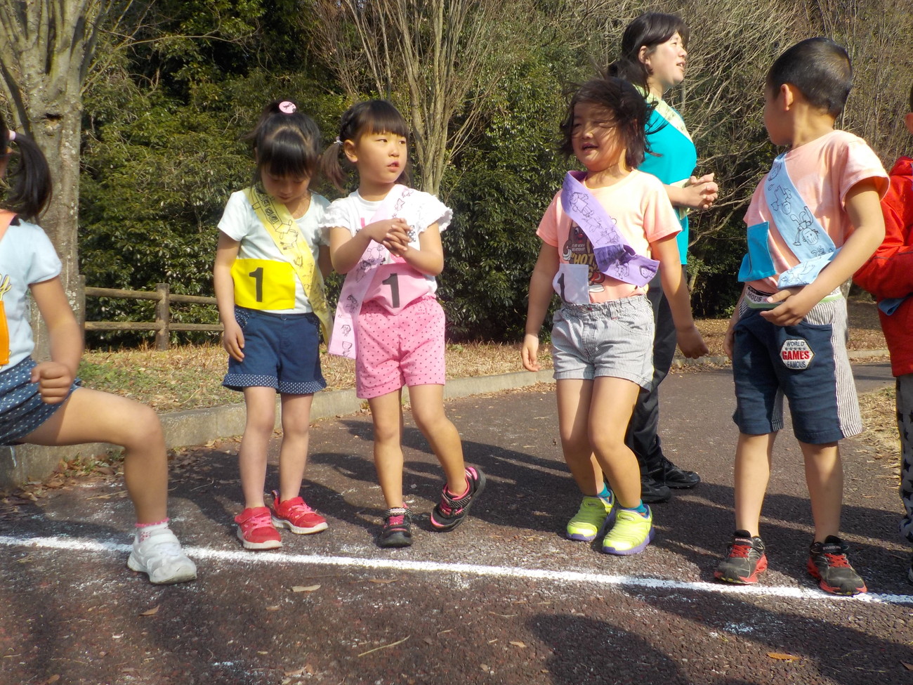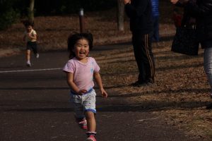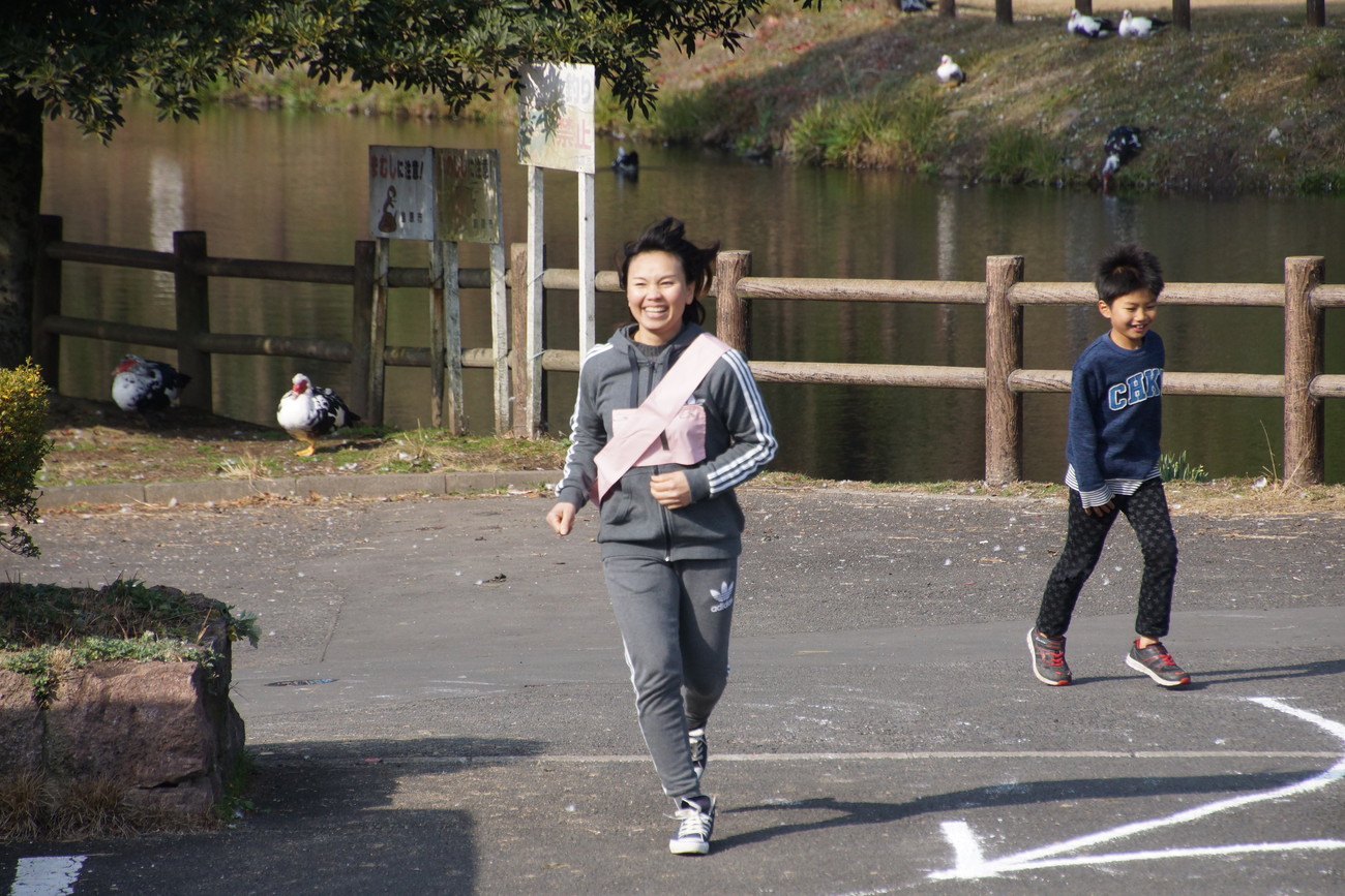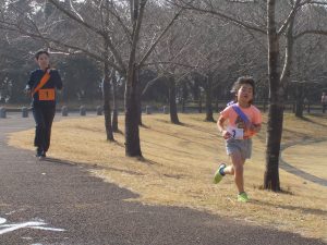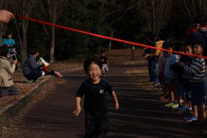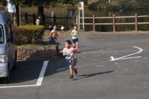 きりん組は距離がさらに伸びて、池の周りを半周と、芝生の周りをぐるりと走ってゴールです