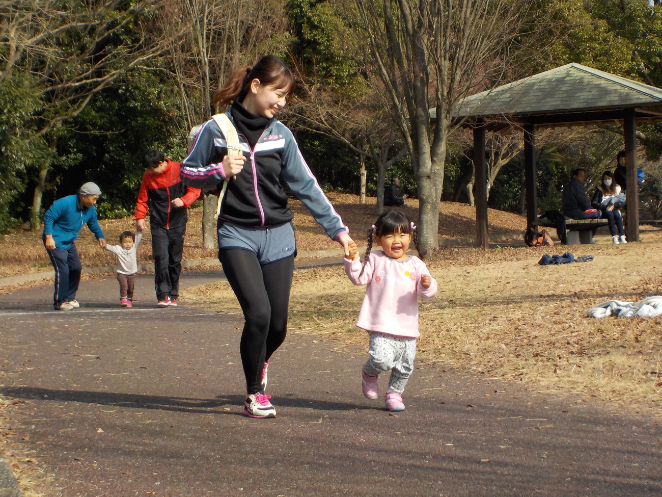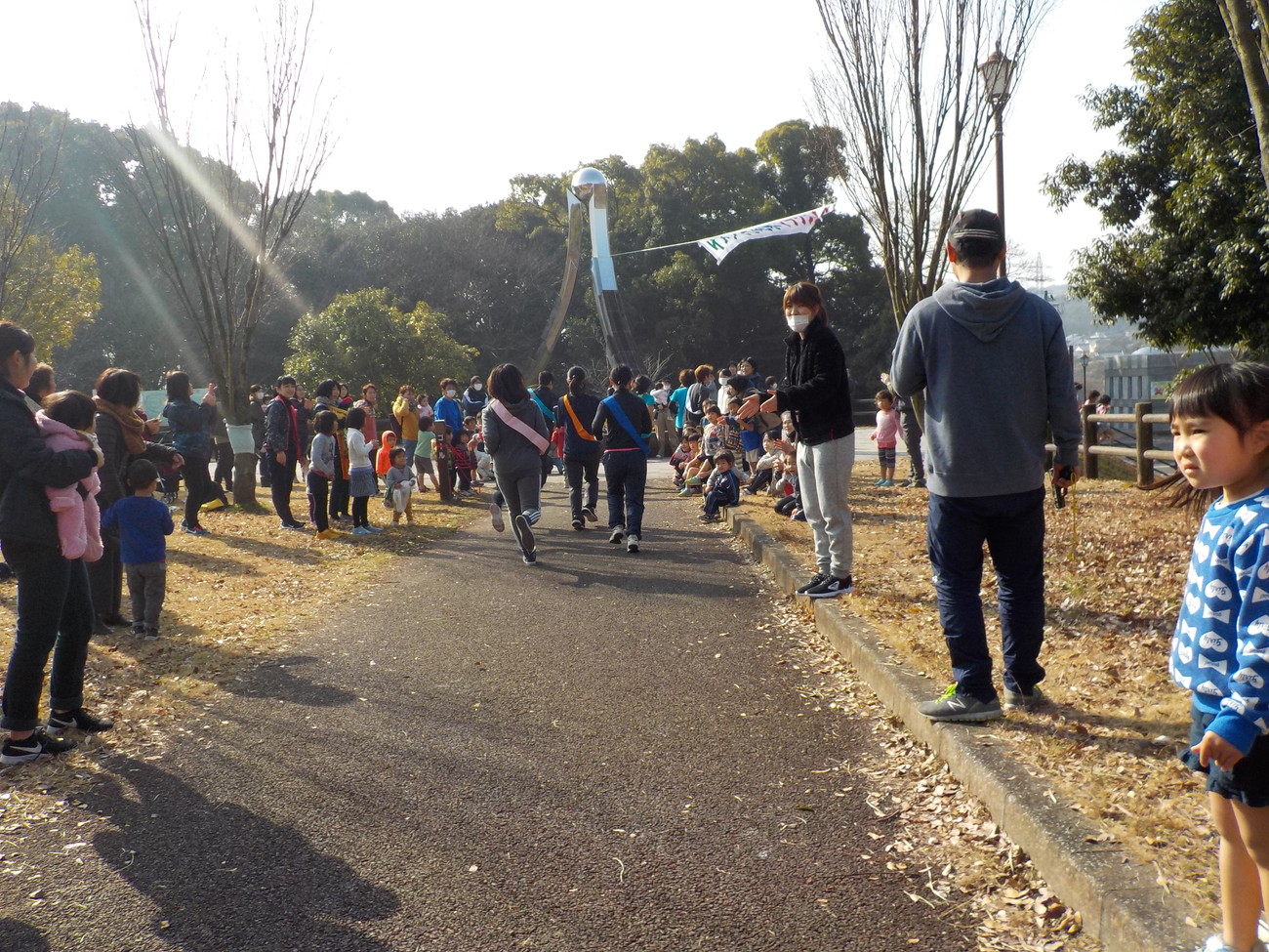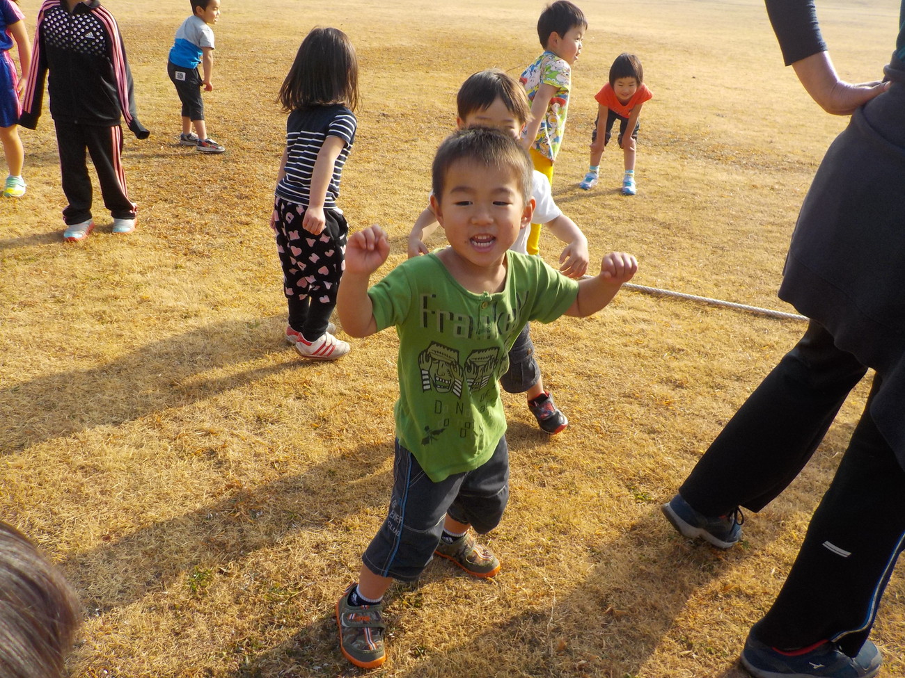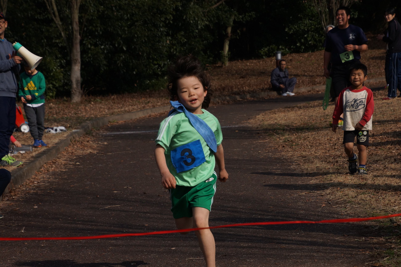 きりん組は距離がさらに伸びて、池の周りを半周と、芝生の周りをぐるりと走ってゴールです