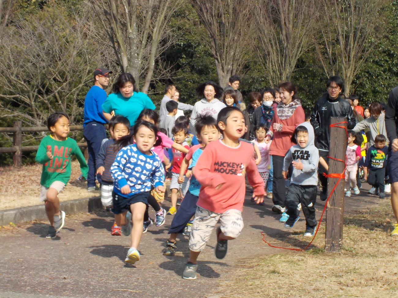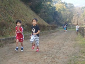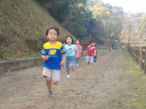 さあ、いよいよ年長ぞう組さんです。 ぞう組は池の周りから、森の中のきつい坂を上って、池の周りをまわって芝生の周りをぐるりと走る、ロングコース。