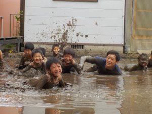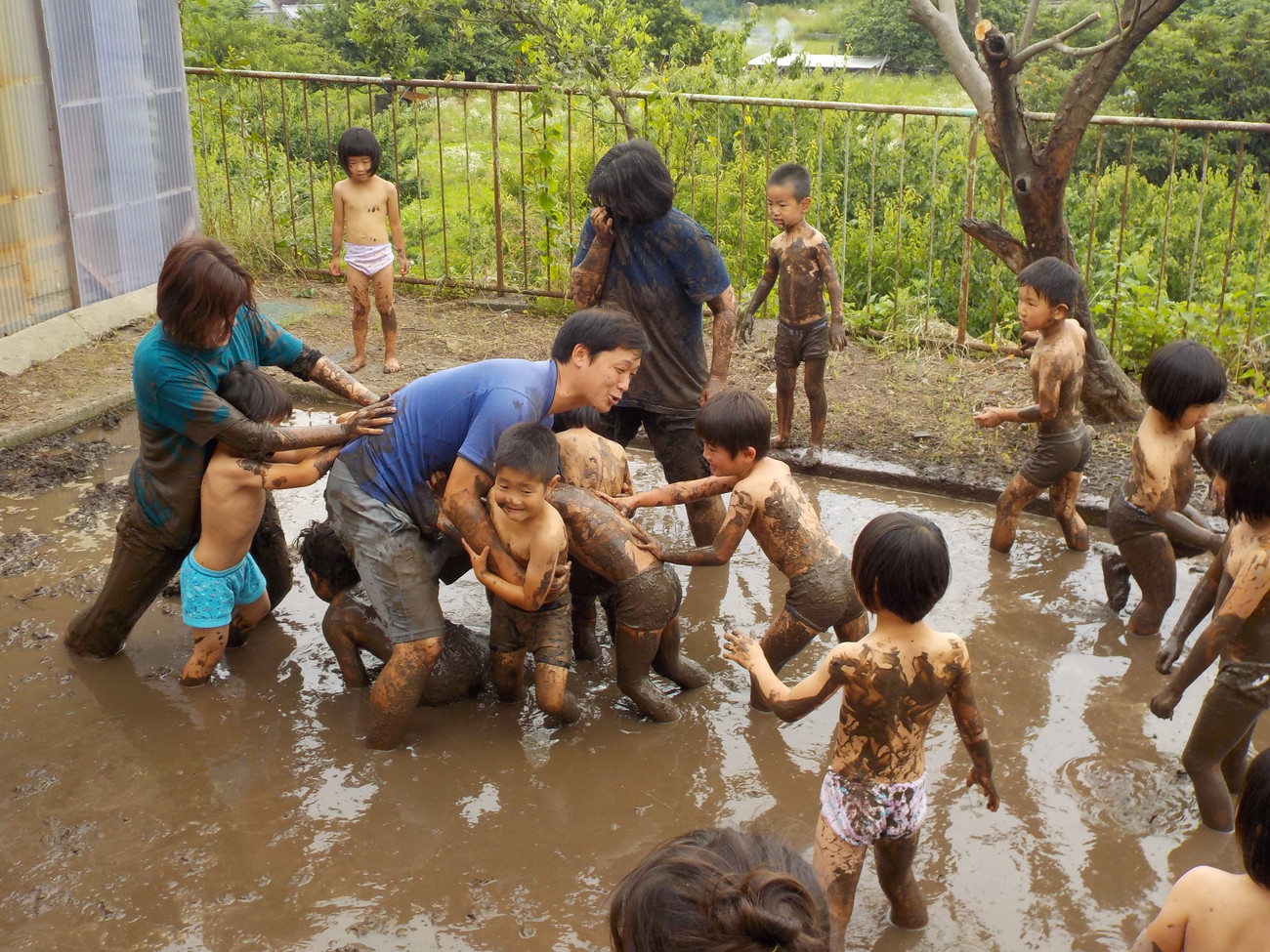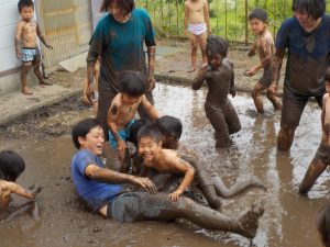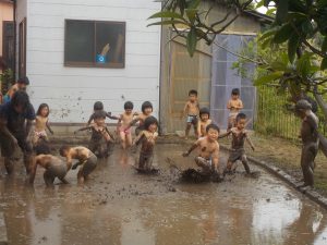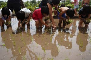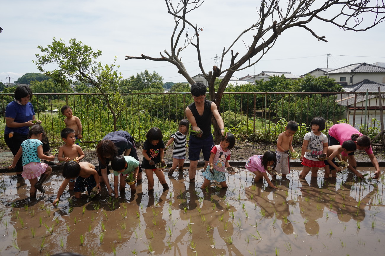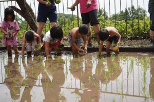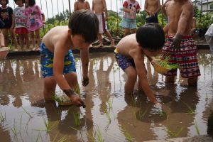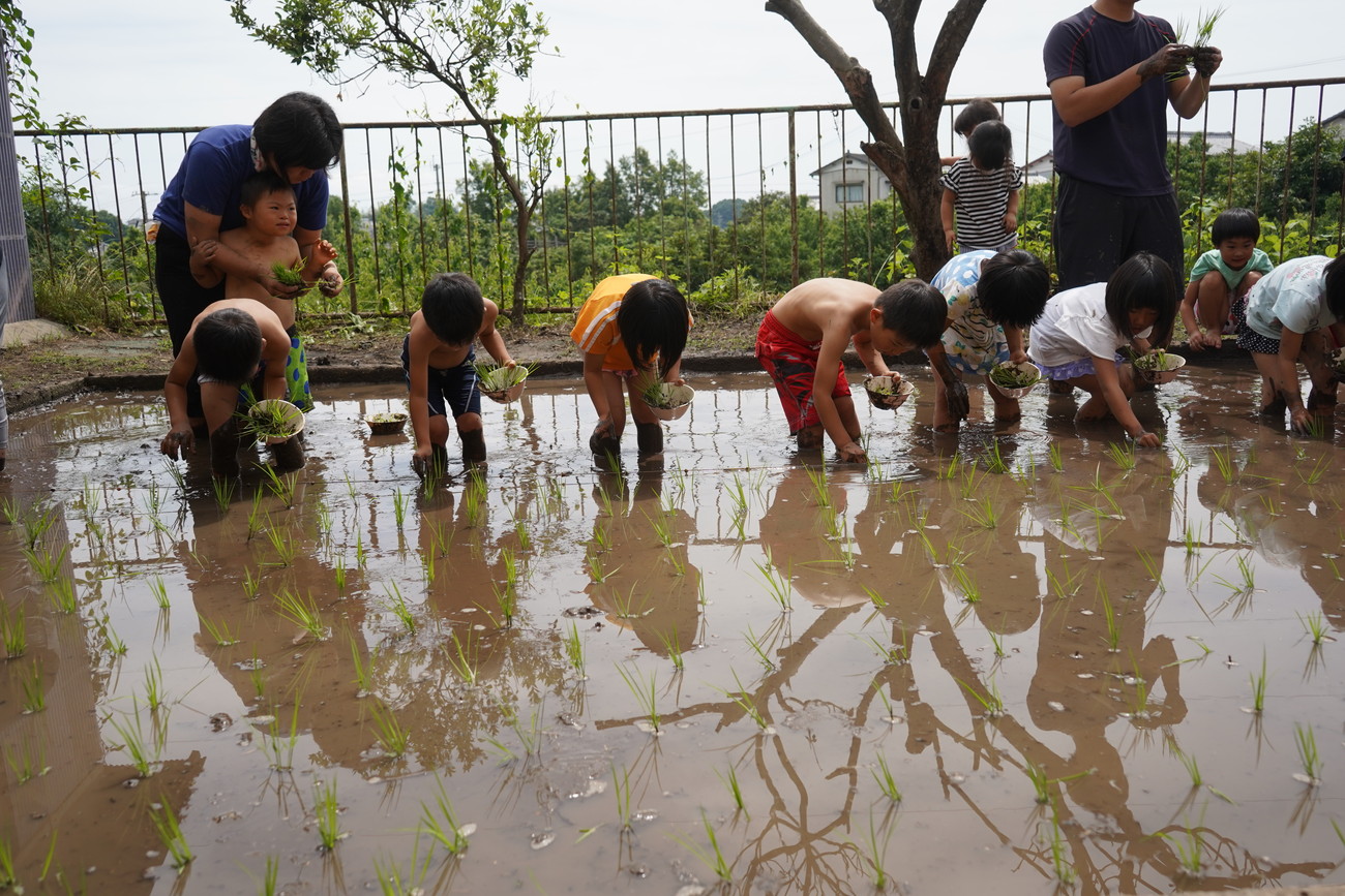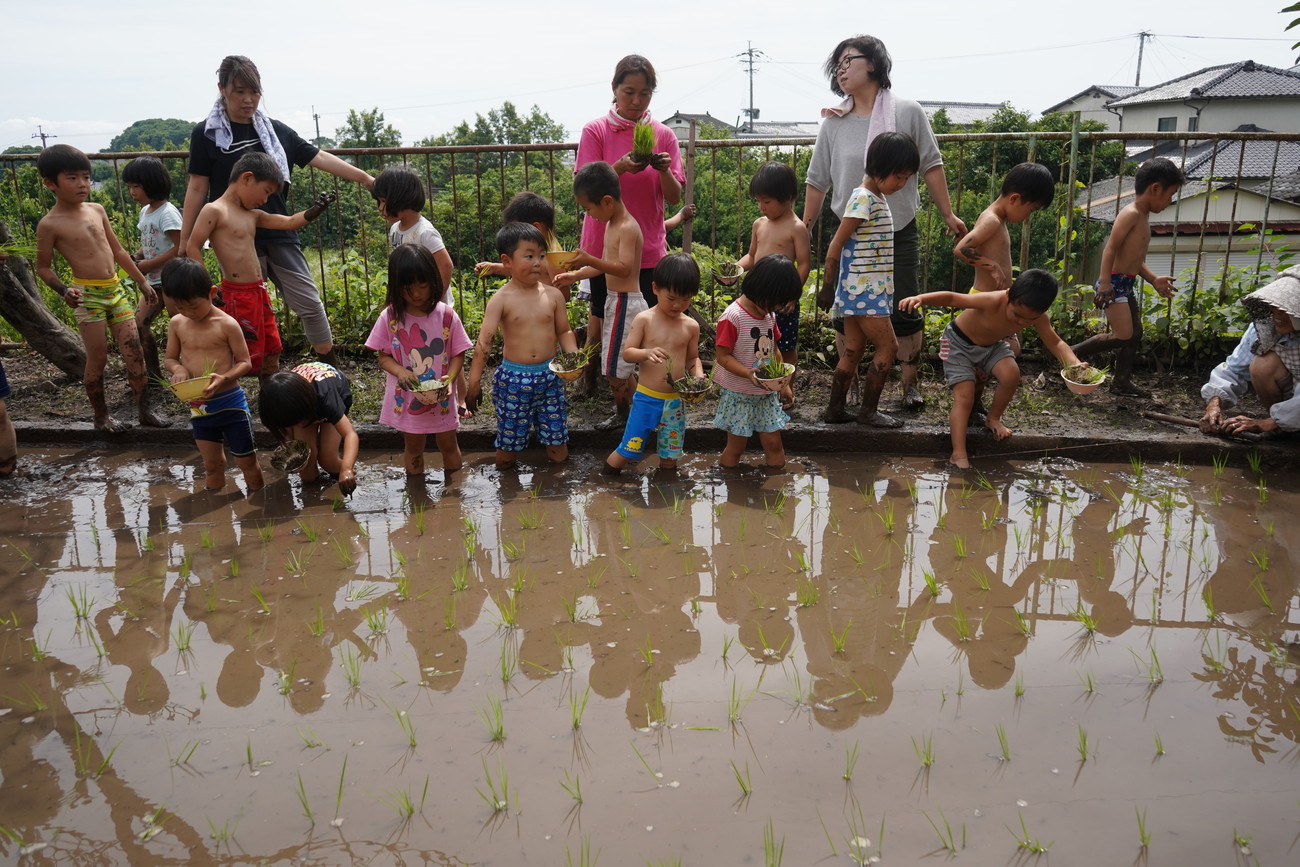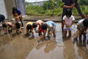 何度も踏んで柔らかくなった田んぼに苗を植えていきます