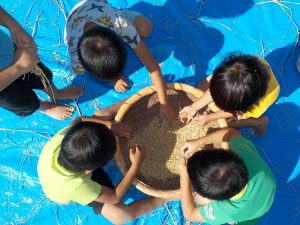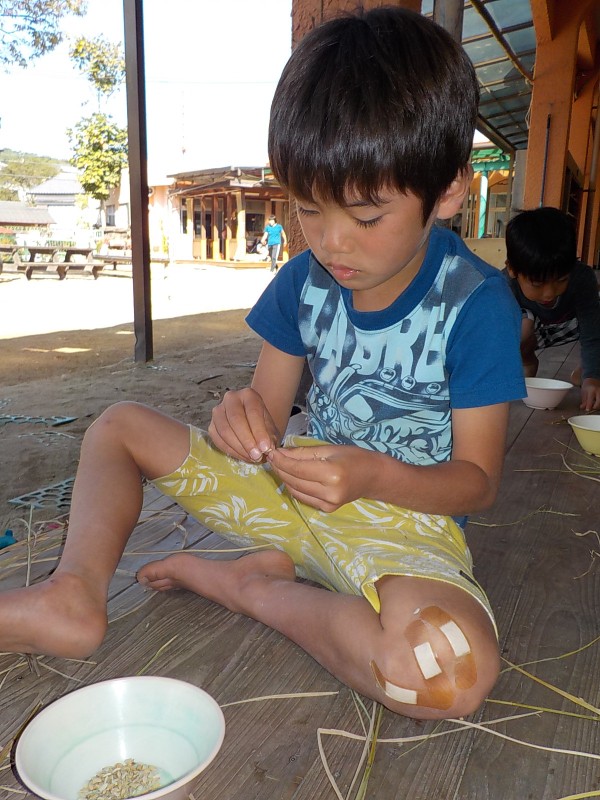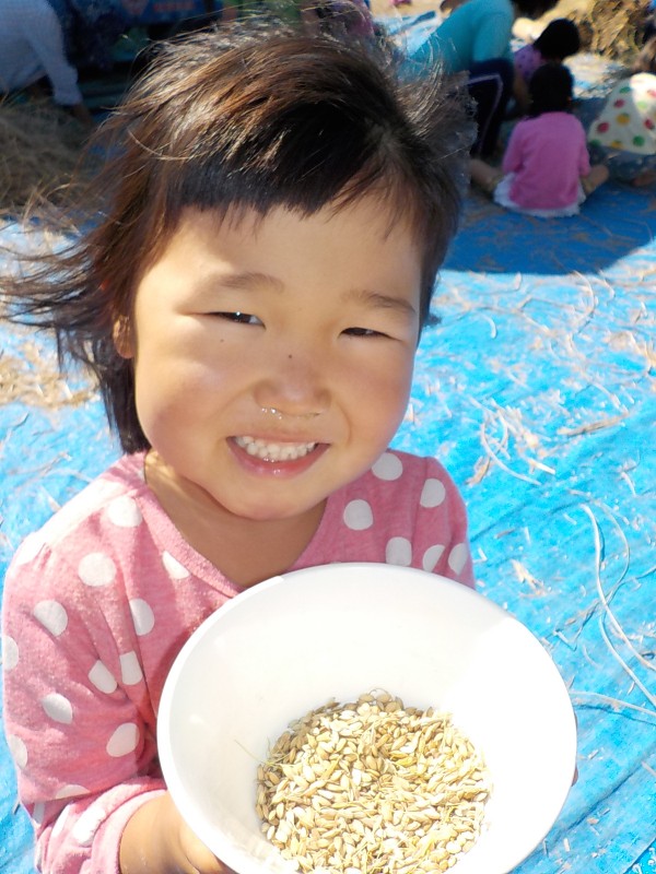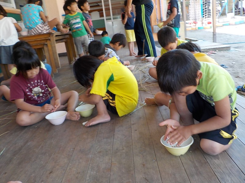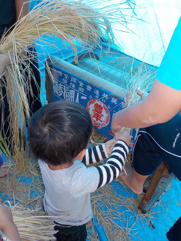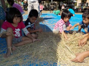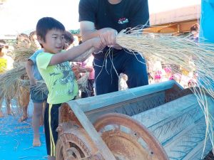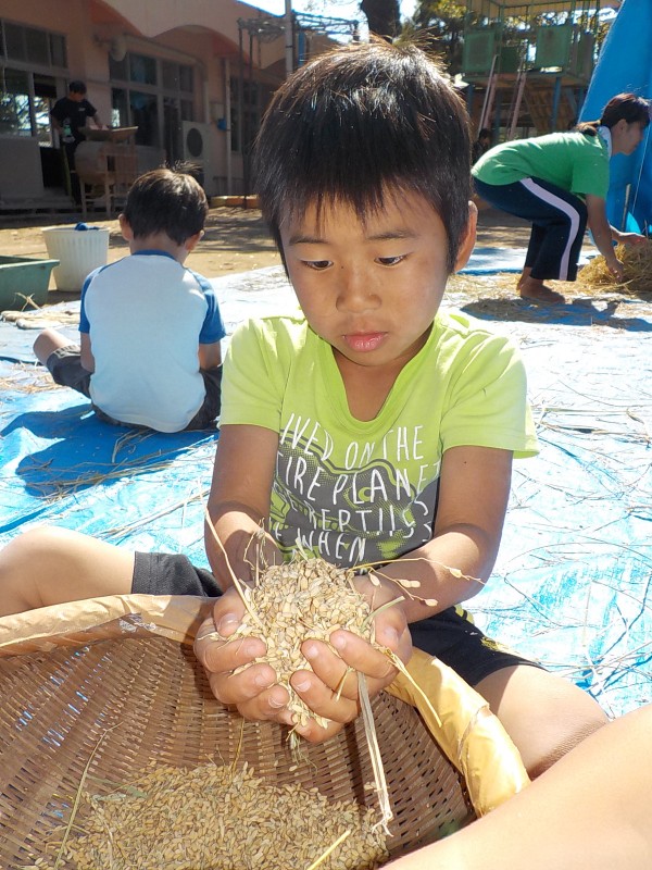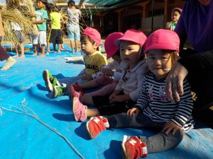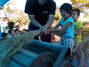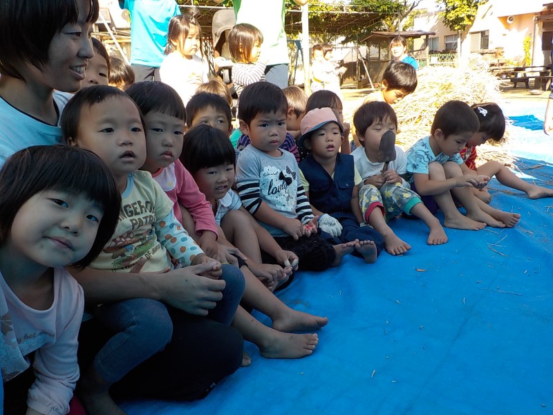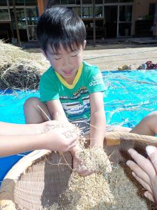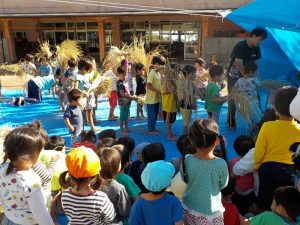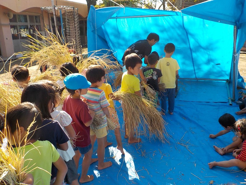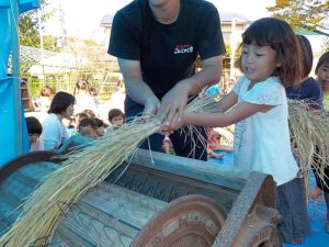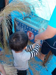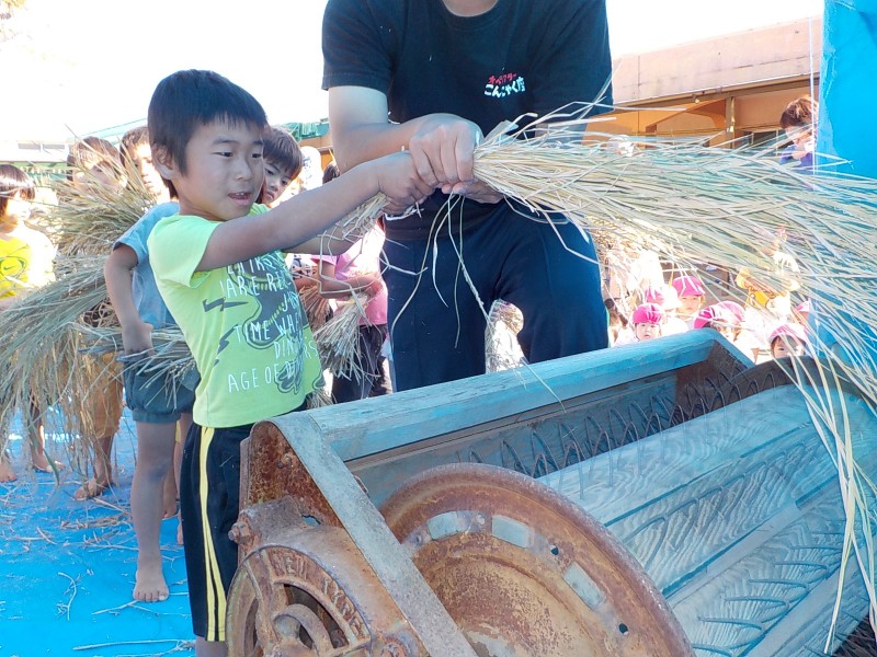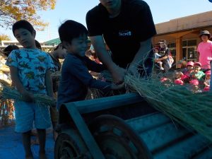 年長ぞう組さんが 稲束を持って千歯扱き(せんばこき)の前に並びます