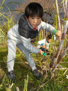 背丈以上もあるサトウキビをのこぎりで切っていきます