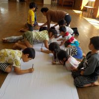 もうすぐ5月の節句がやってきます 年長のぞうぐみさんは鯉のぼりづくりにとりかかりました きょうは布に下書きをしていきます わぁ 大きい布だな~ まずは輪郭をひとりずつバトンタッチしながら描いて …
