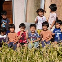 保育園の田んぼにお米がなりました さあ 今日は稲刈りです 小さいクラスも 応援にきました 豊年満作 稲刈りだぁ おお! さすが ぞうぐみさん ときど …