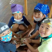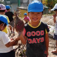 保育園の畑でサツマイモが育ちました さあ 芋掘りにいくぞ! って、なんでスコップを頭の上に乗せてるのかな? このお芋、実は一本のツルでつながってるんです なので今回は そのツルをできるだけ切ら …