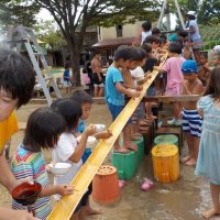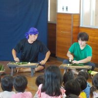 稲刈りをして3日間、刈った稲を干しました 今日はその稲を脱穀します 年長ぞう組さんが 稲束を持って千歯扱き(せんばこき)の前に並びます 何が始まるのか …
